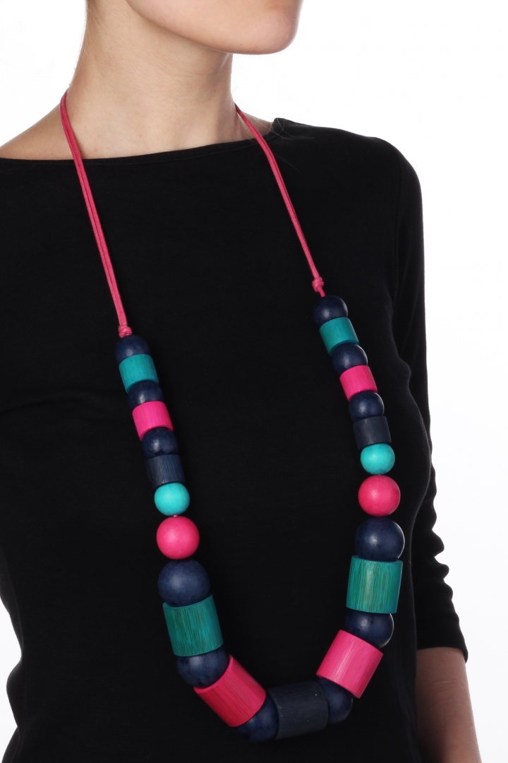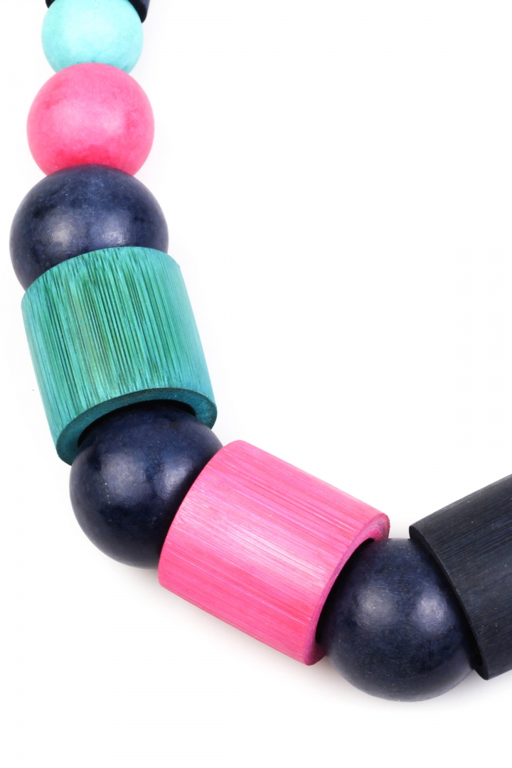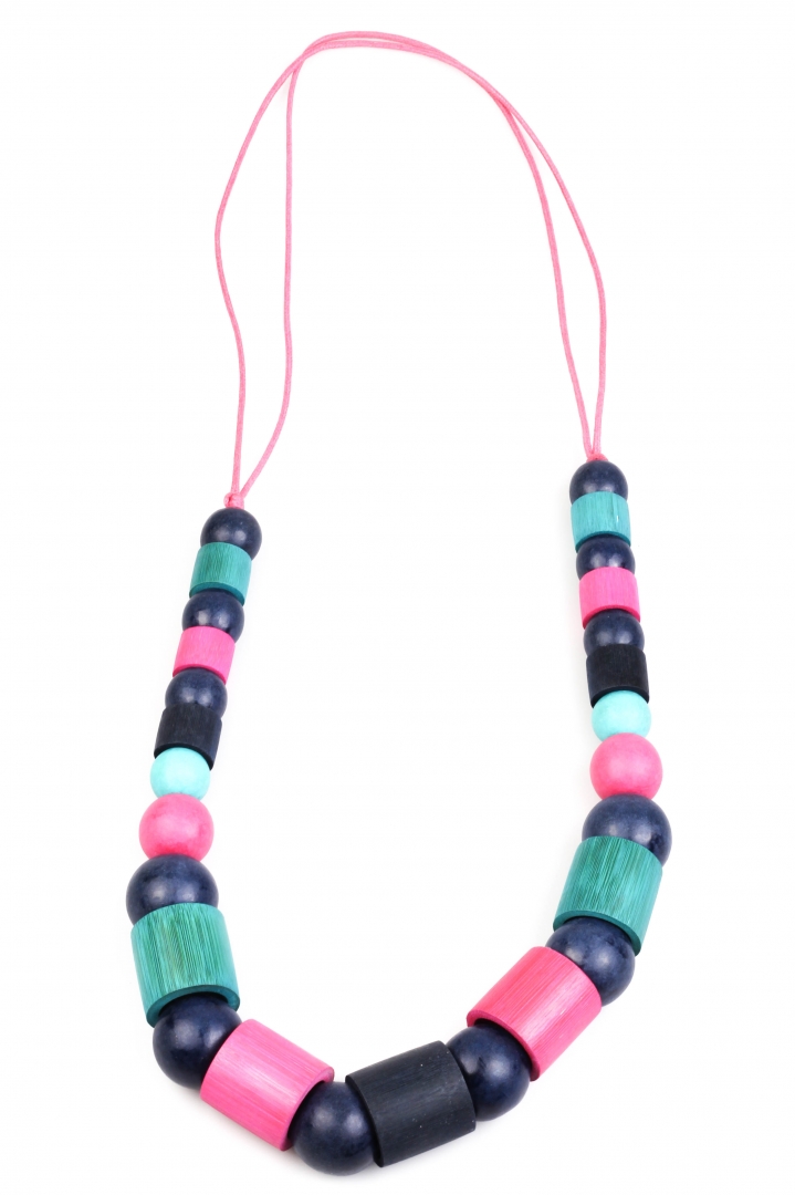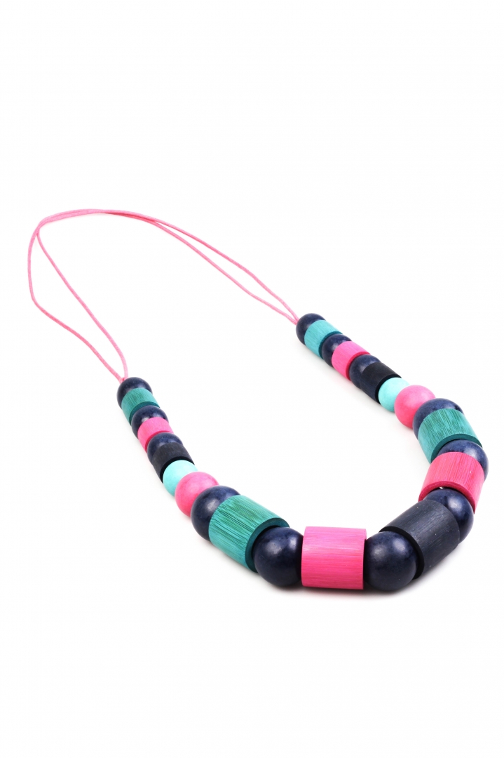 A statement necklace in bold and bright pink, navy and green for fashionable woman.
