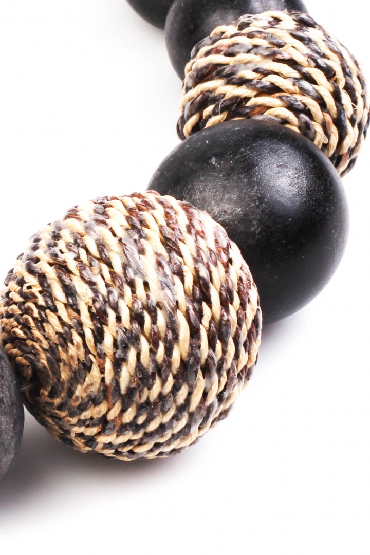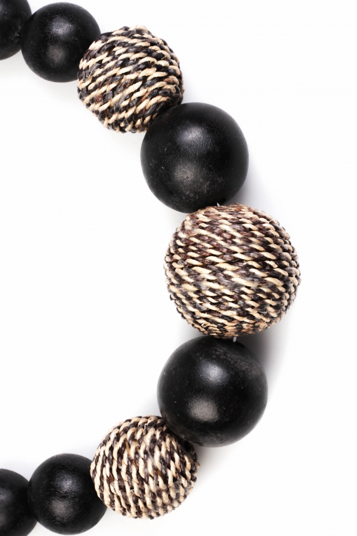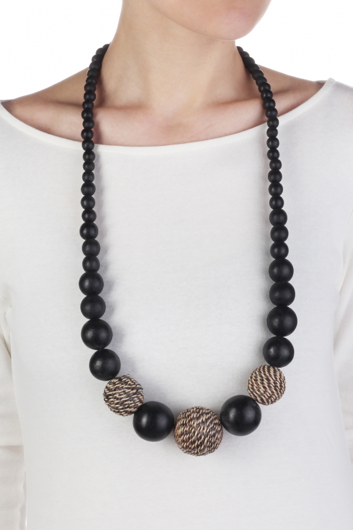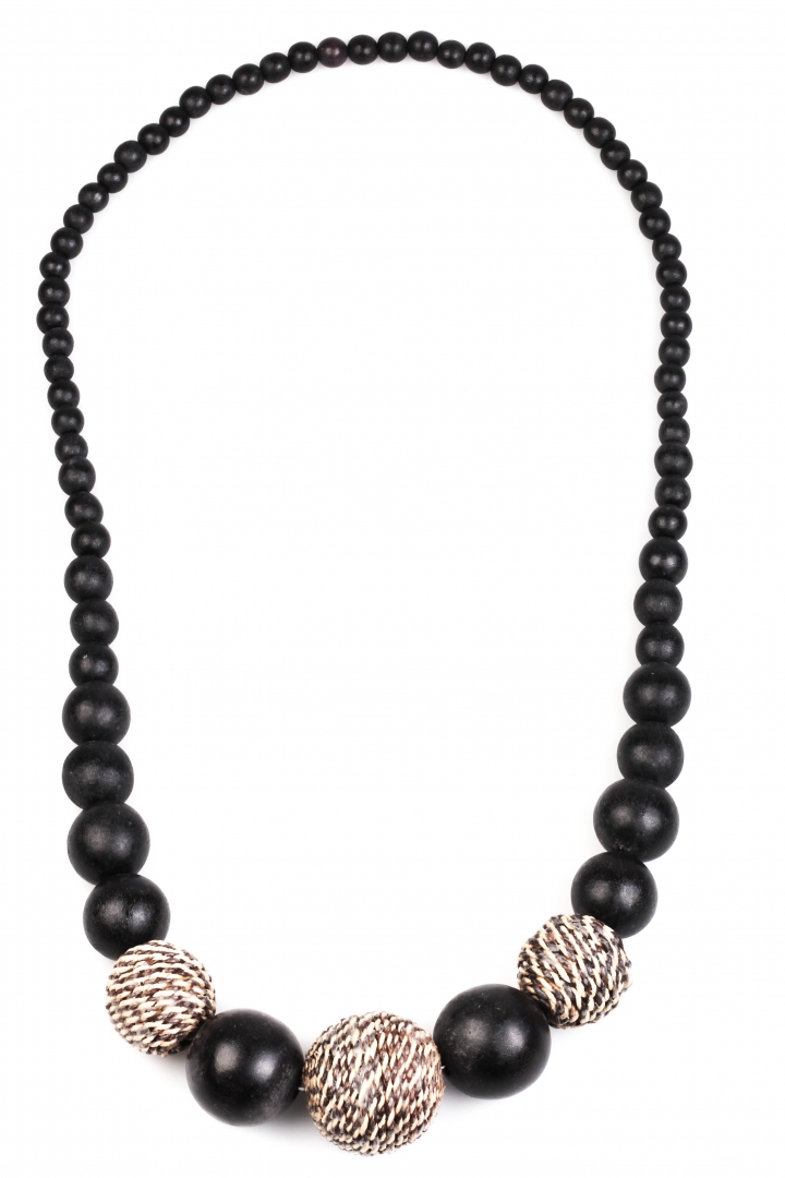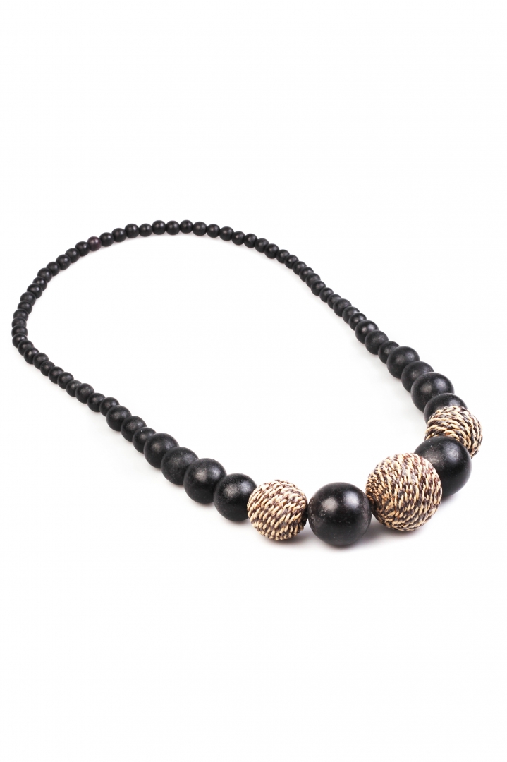 Variously sized wire-wrapped beads come together in a monochrome wooden necklace.