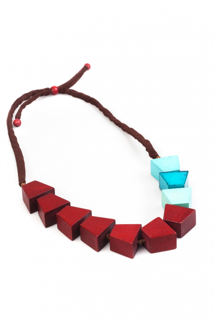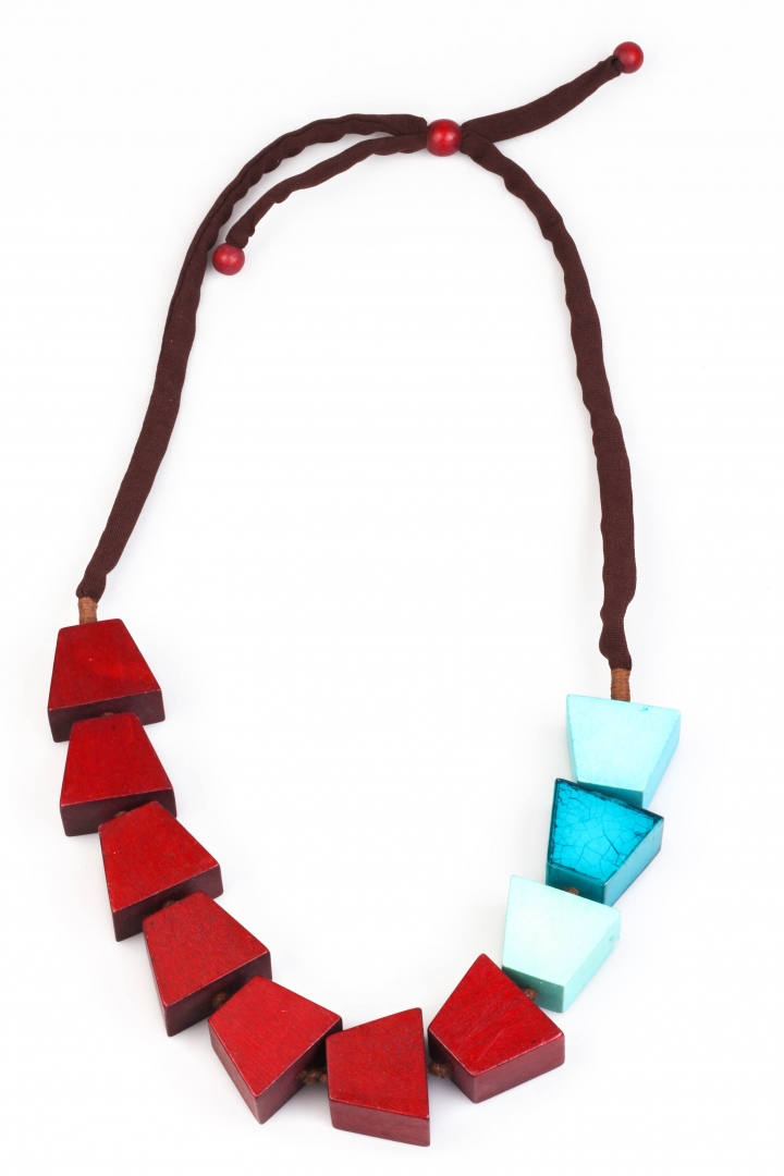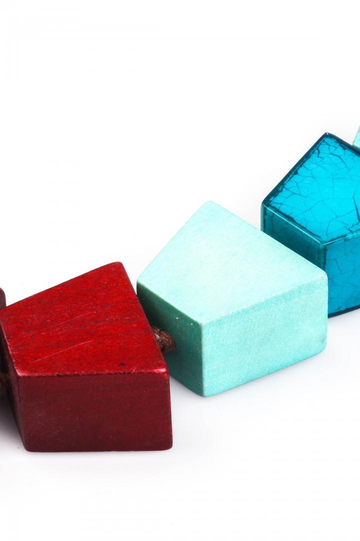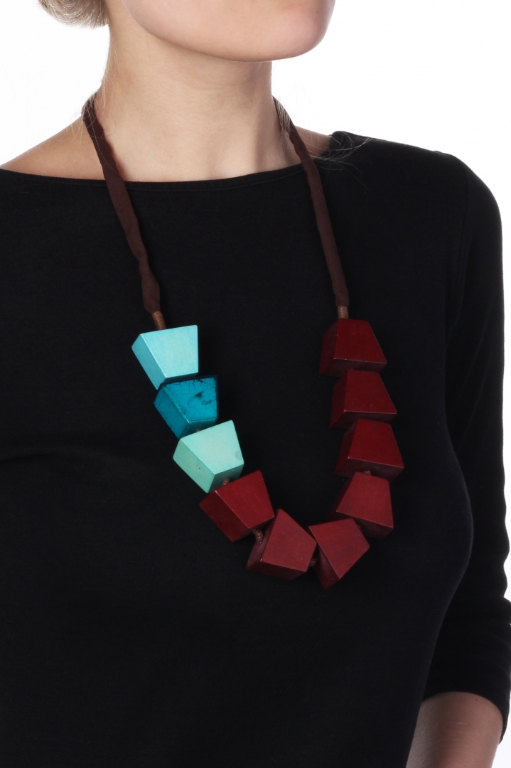 A statement necklace with bold geometric beads and a pop of bright blue shades.