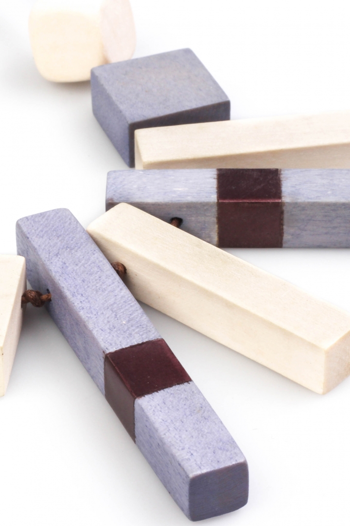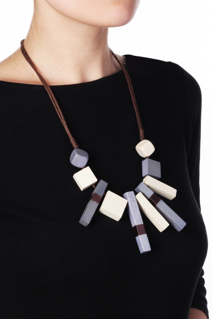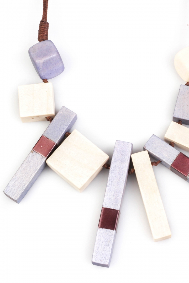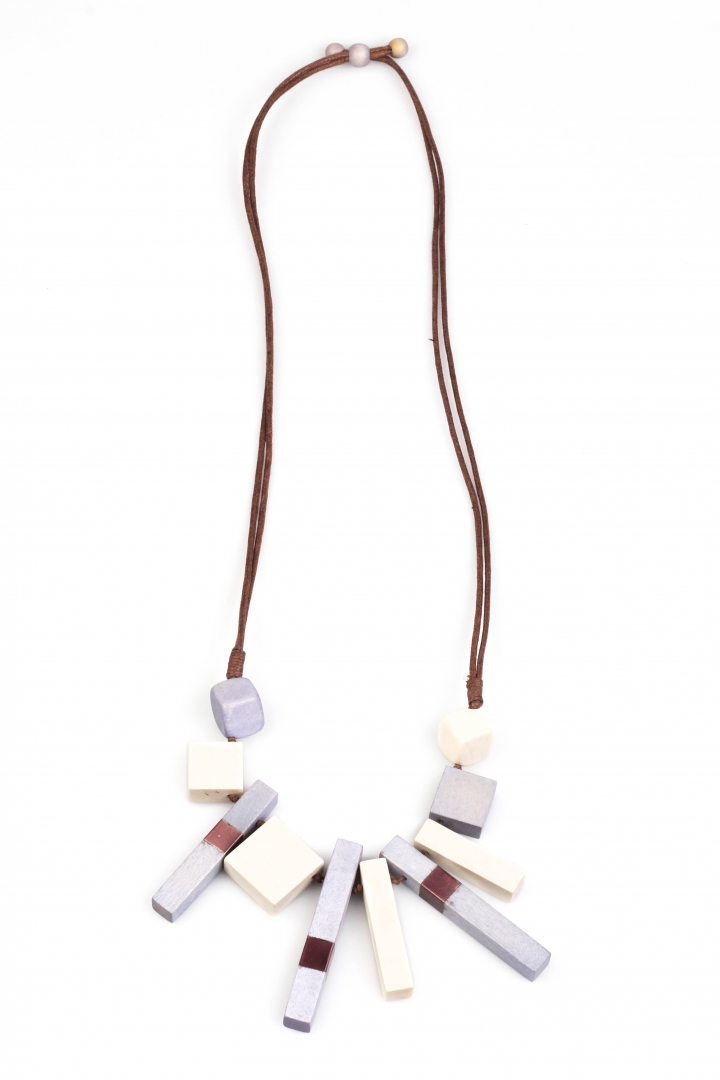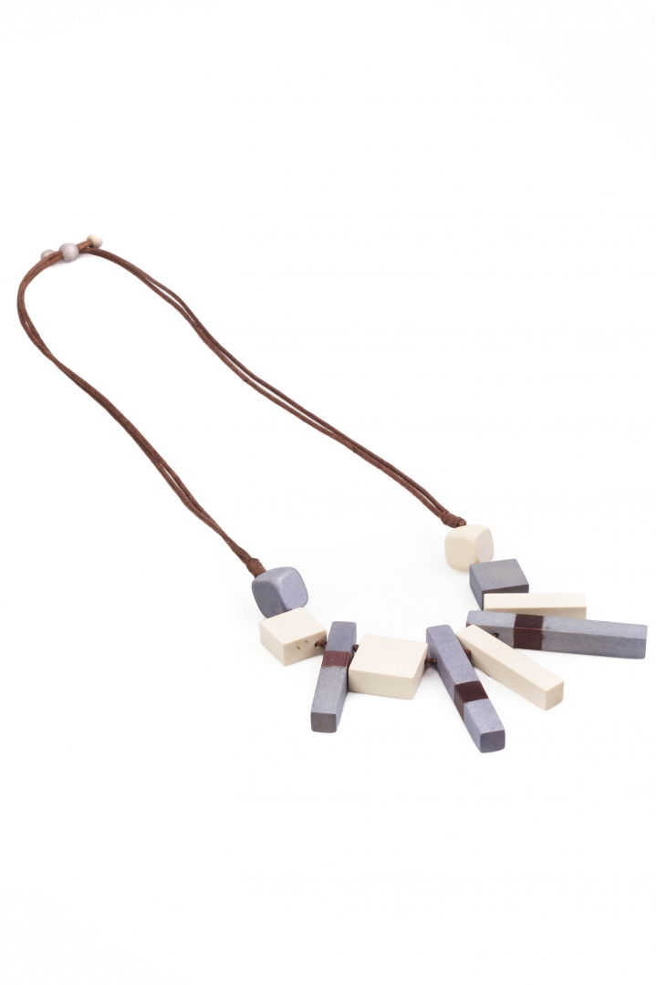 A colorblock wooden necklace in neutral colors and minimalistic geometrical design.