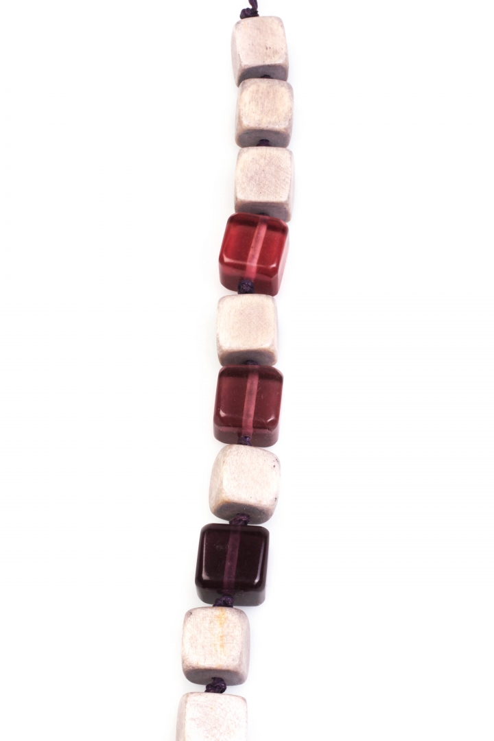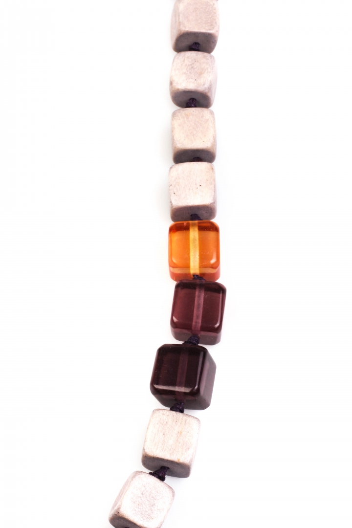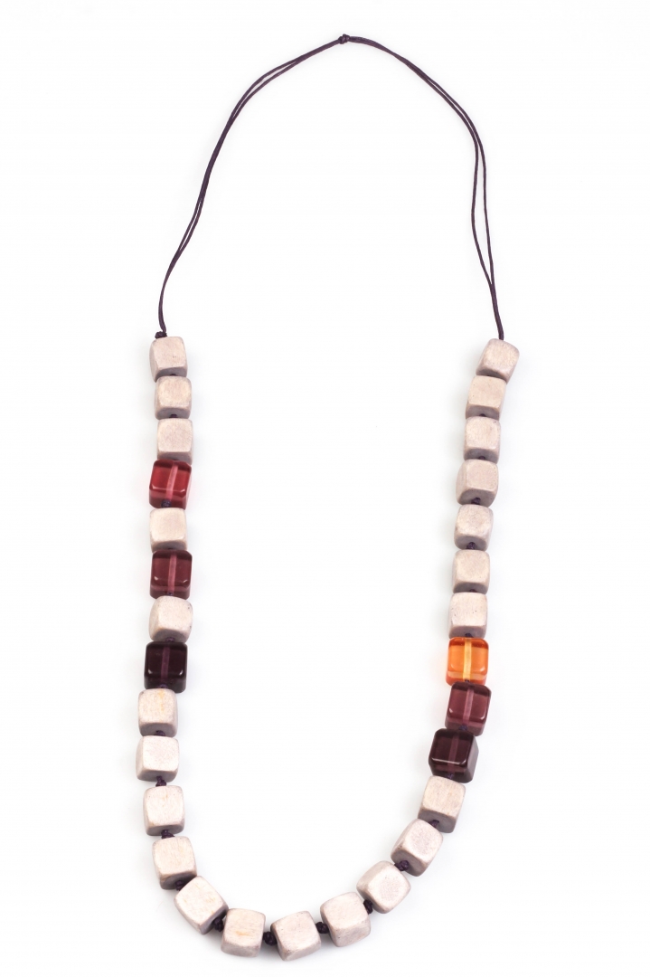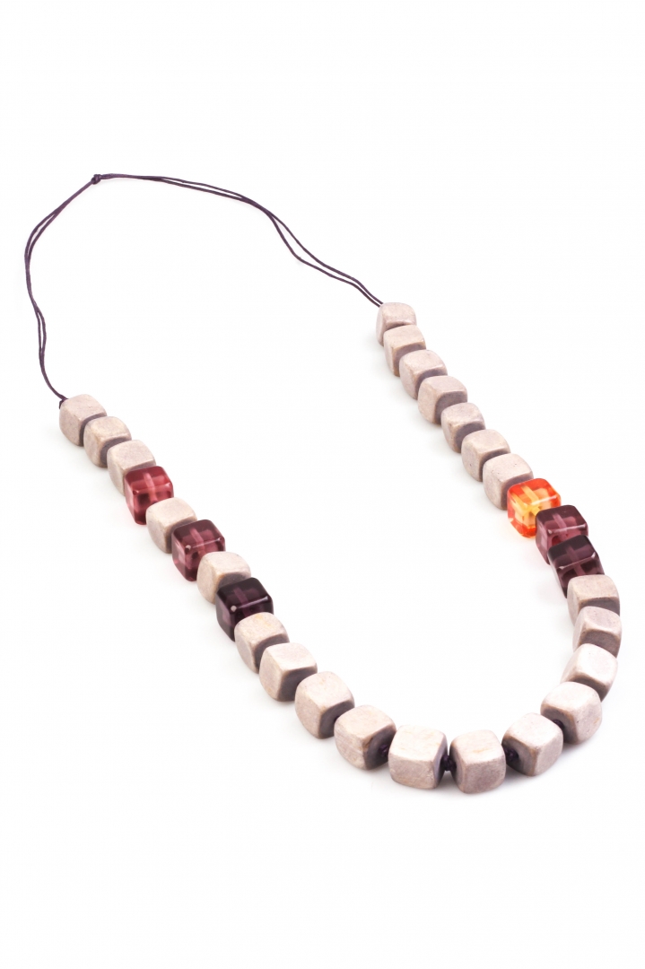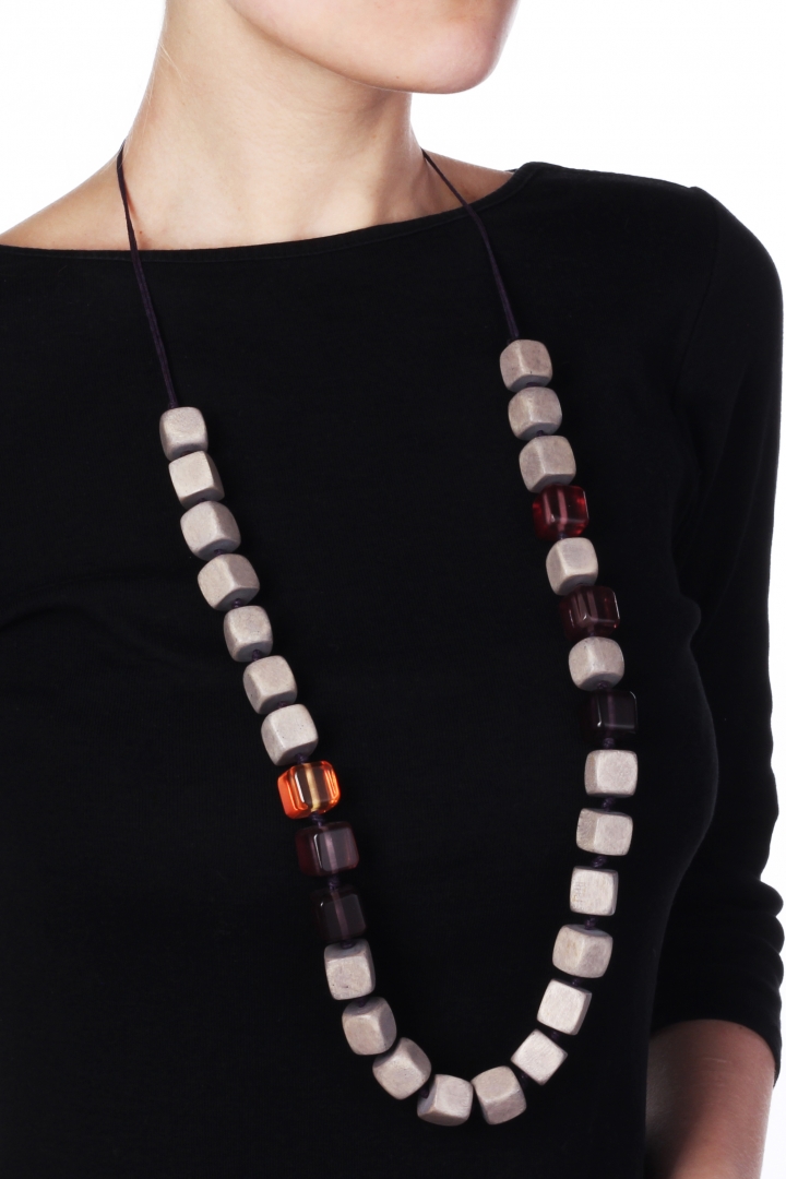A long yet eye-catching statement necklace with transparent red, orange and brown details.