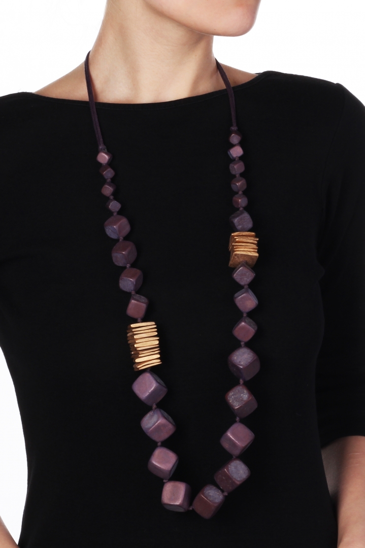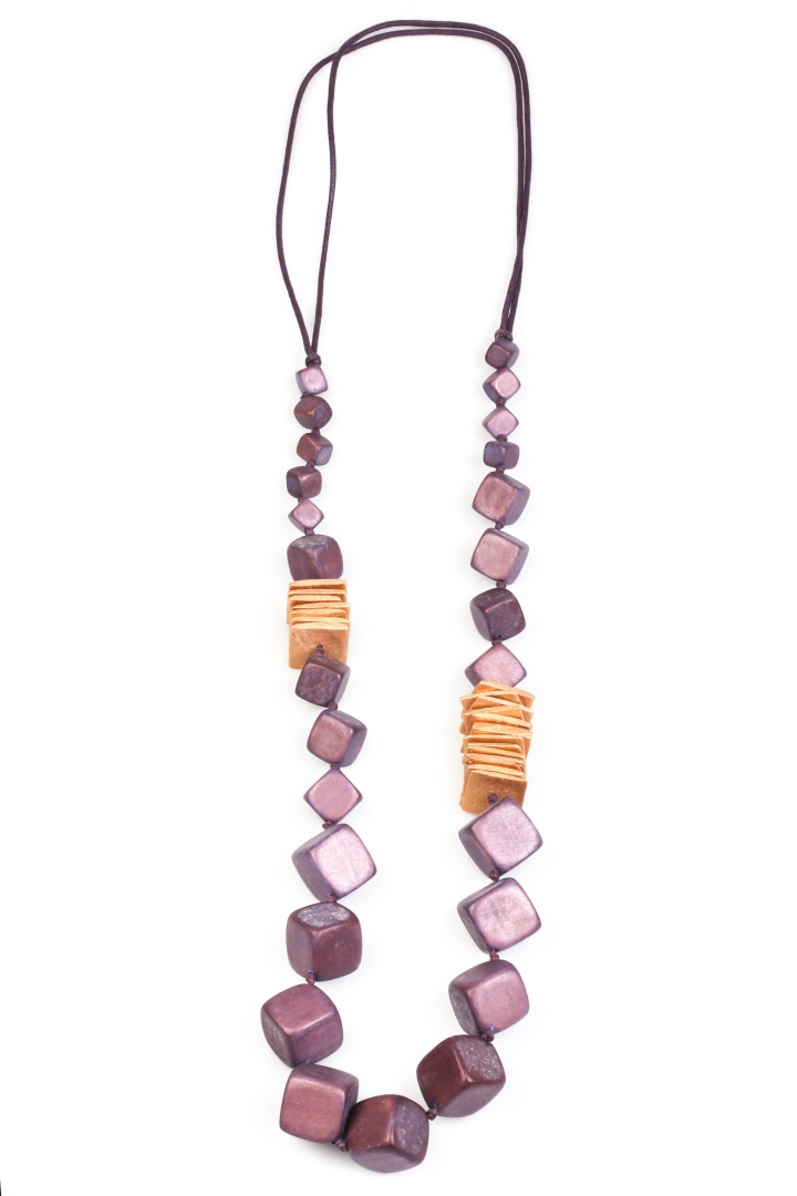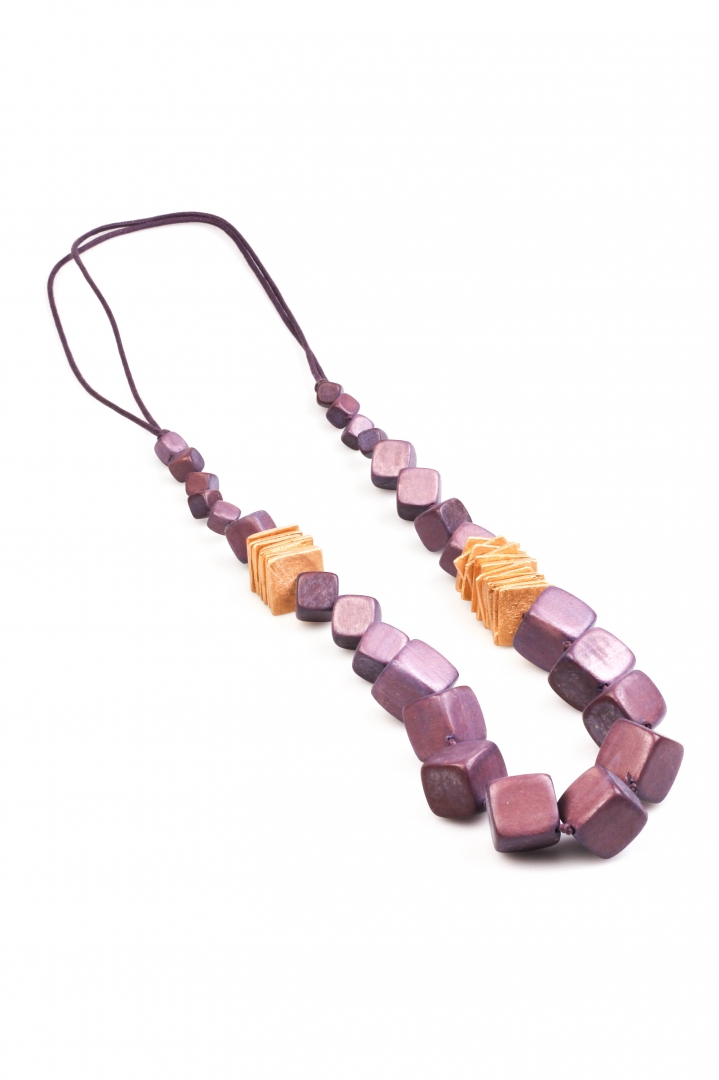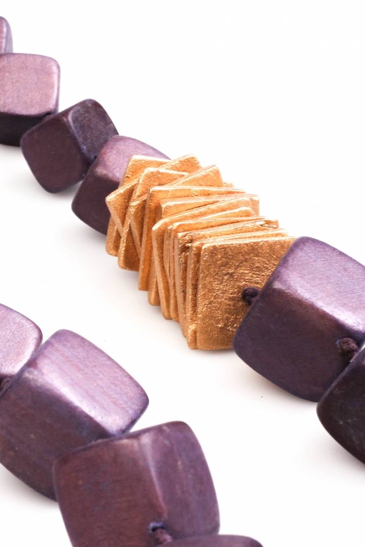 Purple and gold comes in harmony to form a fashionable wooden necklace with a geometrical strict feel to it.