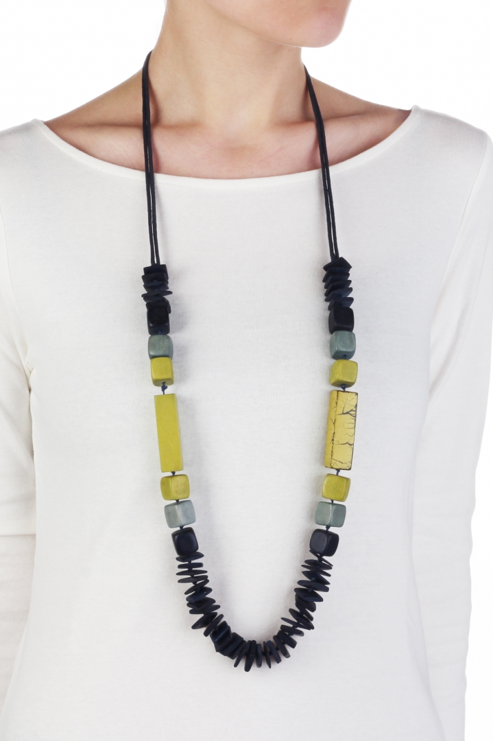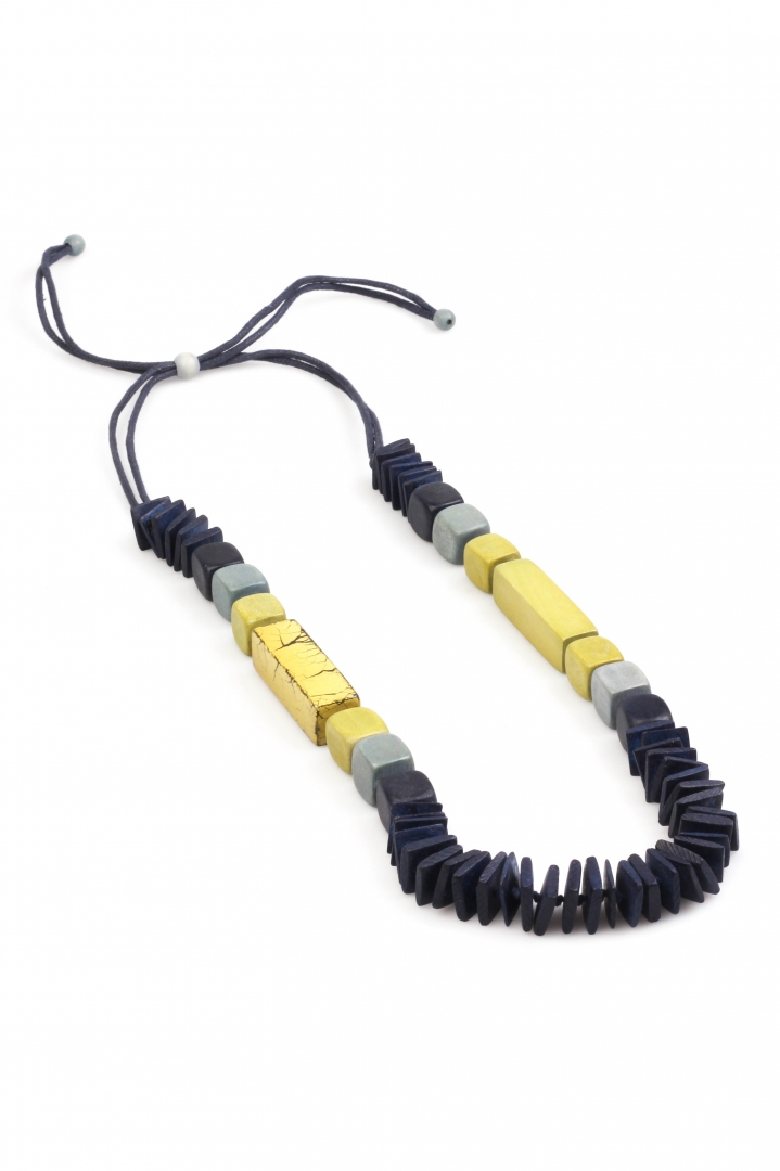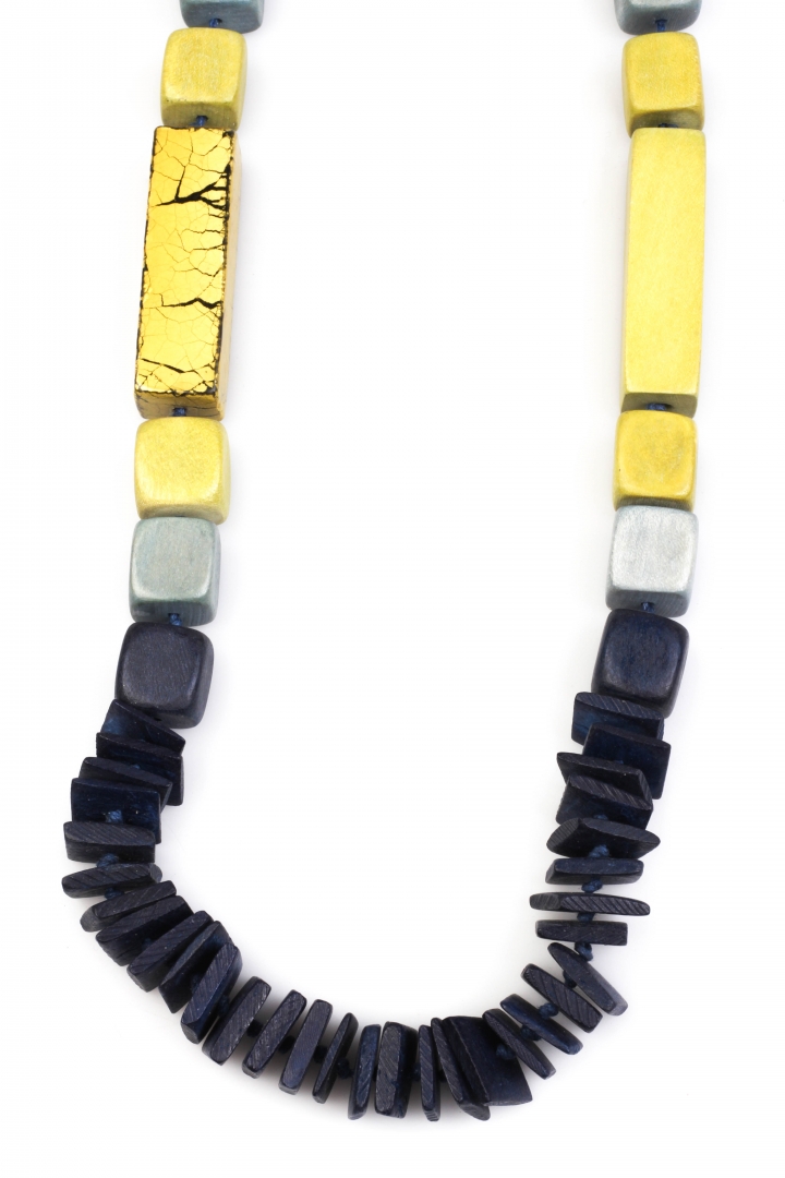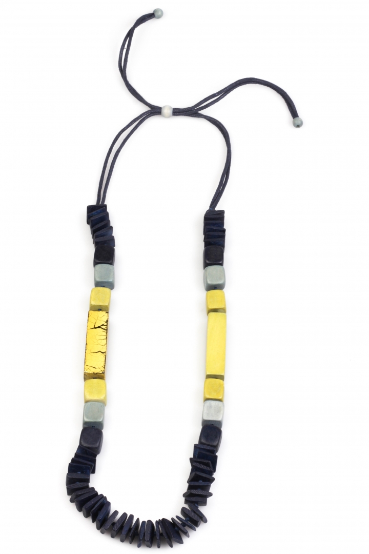 A duo of yellow and navy thin beads circles the marbled details of this wooden necklace.