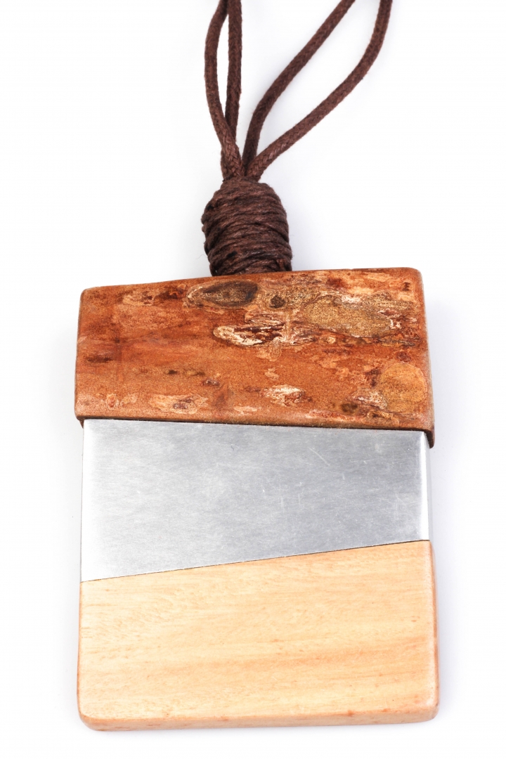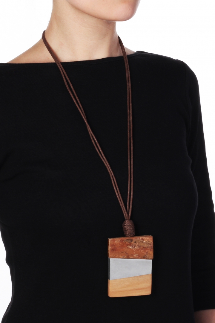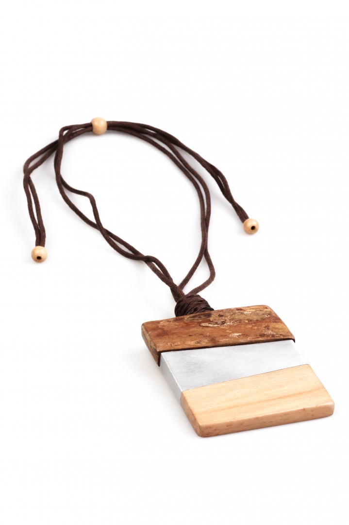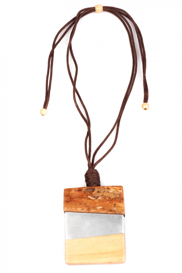 A chunky block shaped necklace with metal and rough wood detailing for a very earthy and boho fashion.