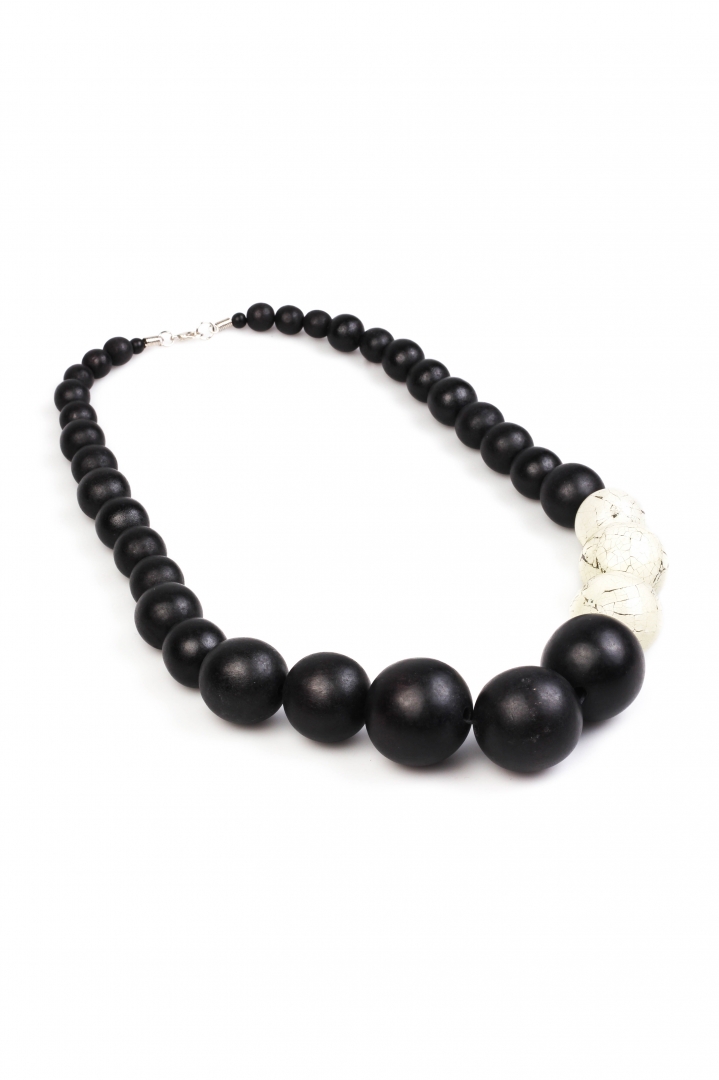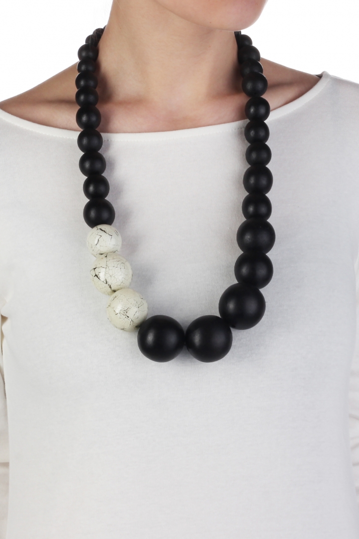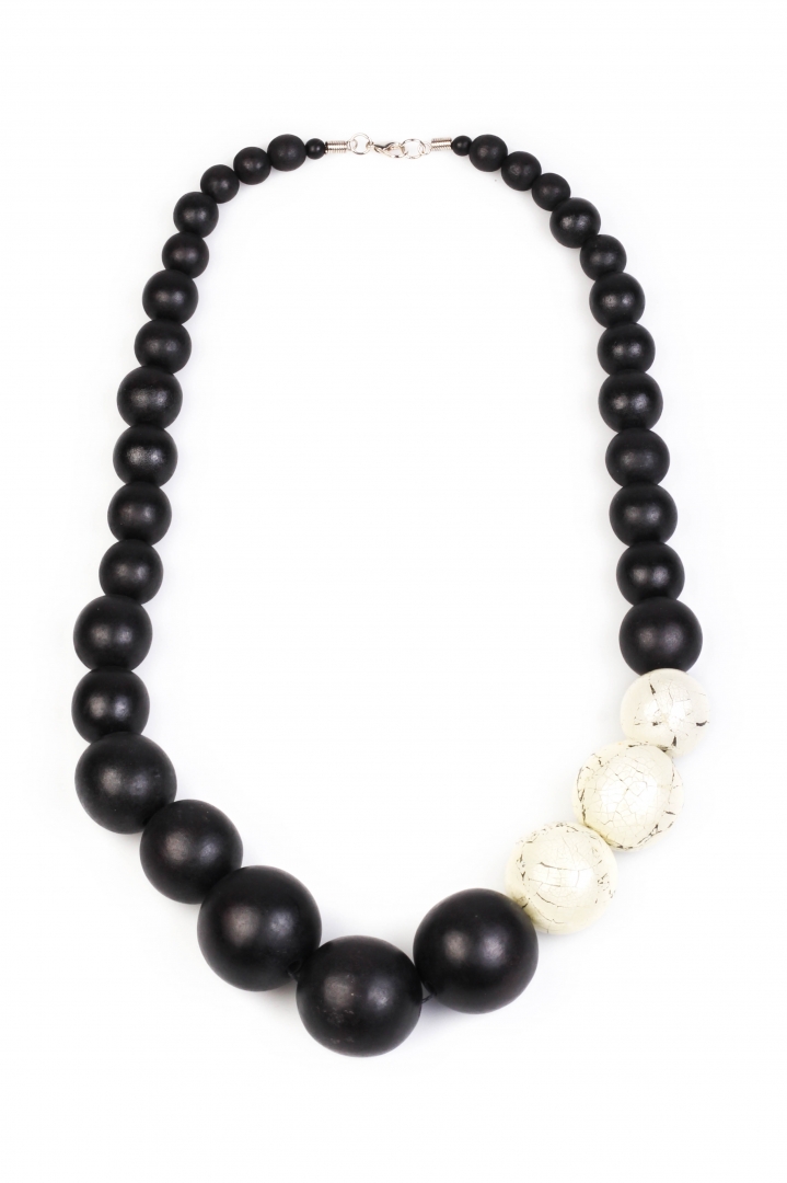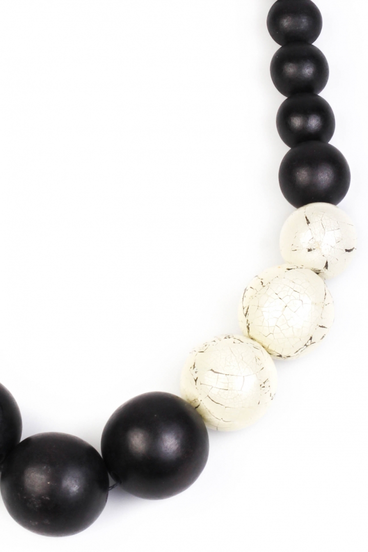 Monochrome wooden necklace with white marbled bead trio encircled by minimalistic black.