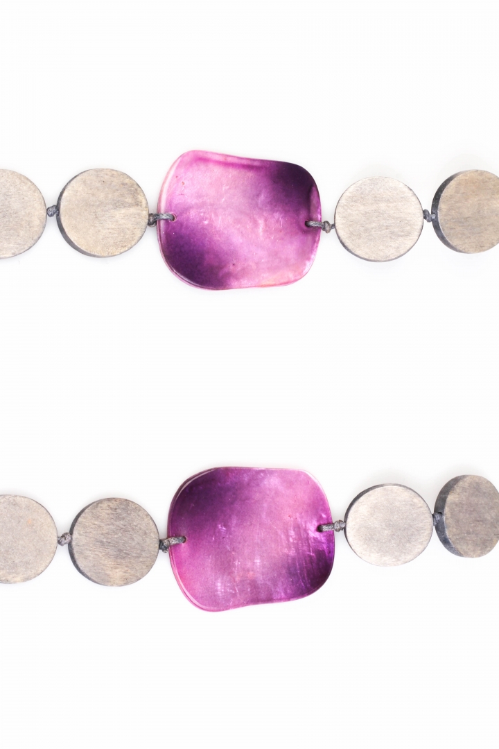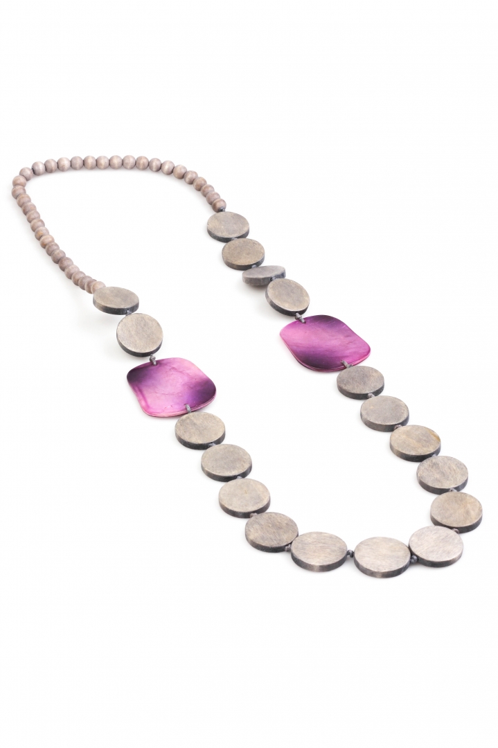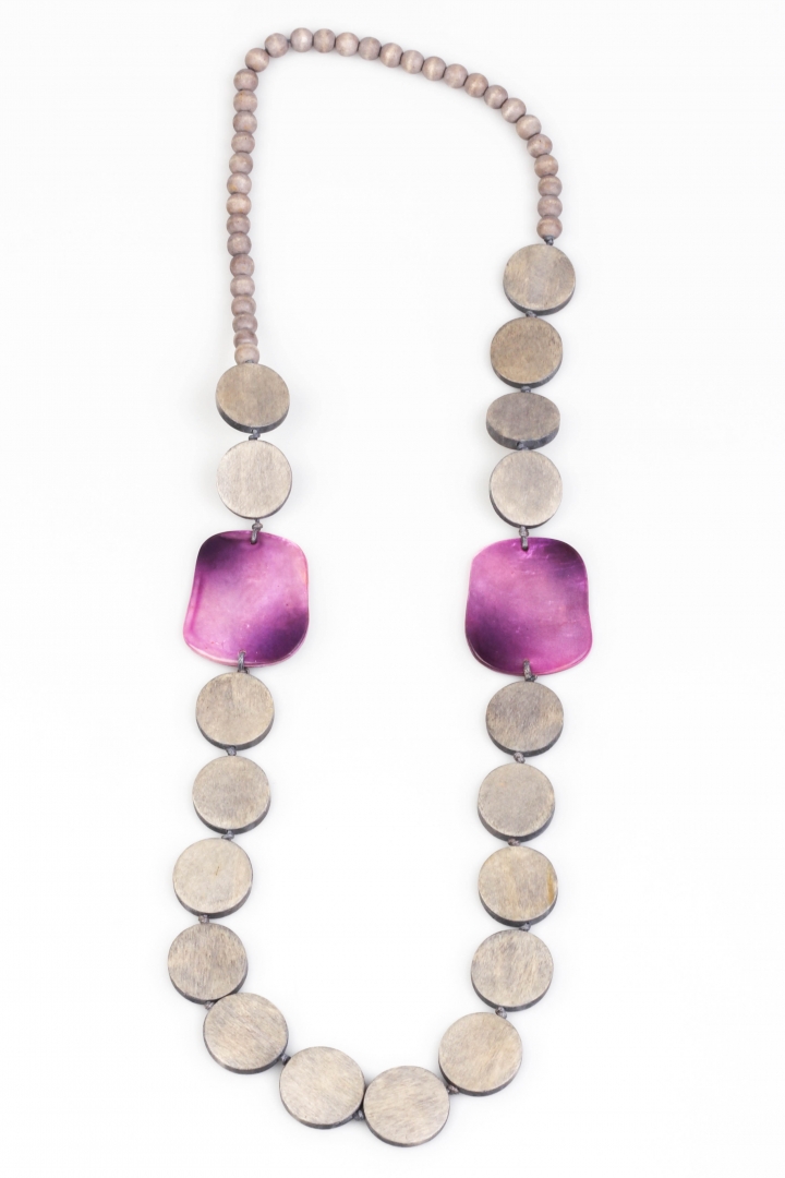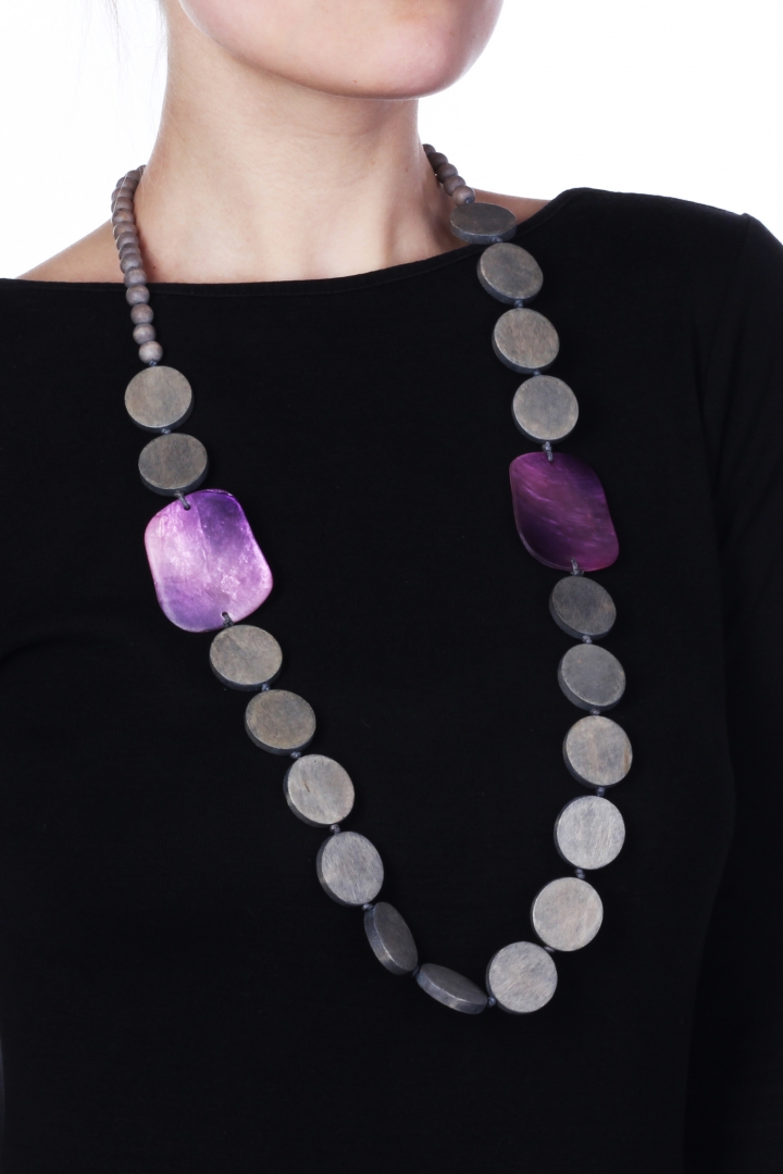 A light wood necklace with a summer touch - purple shell detailing.