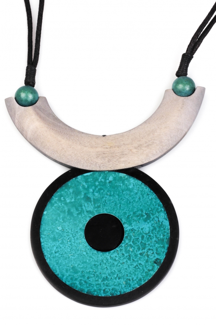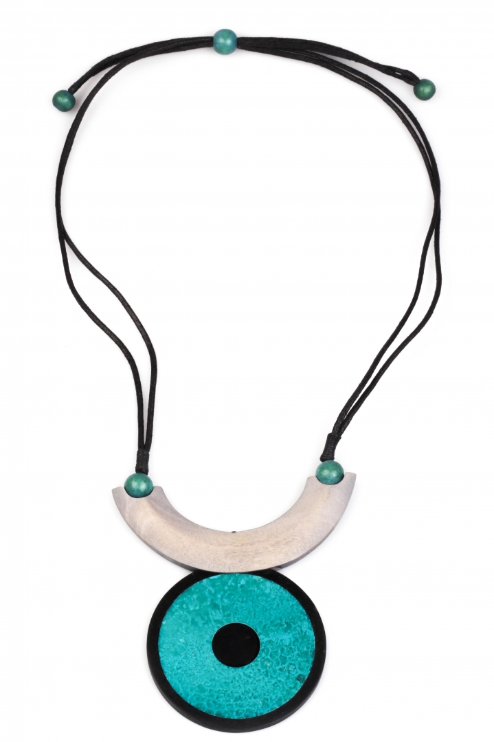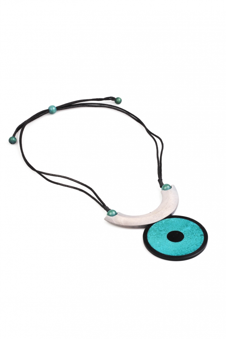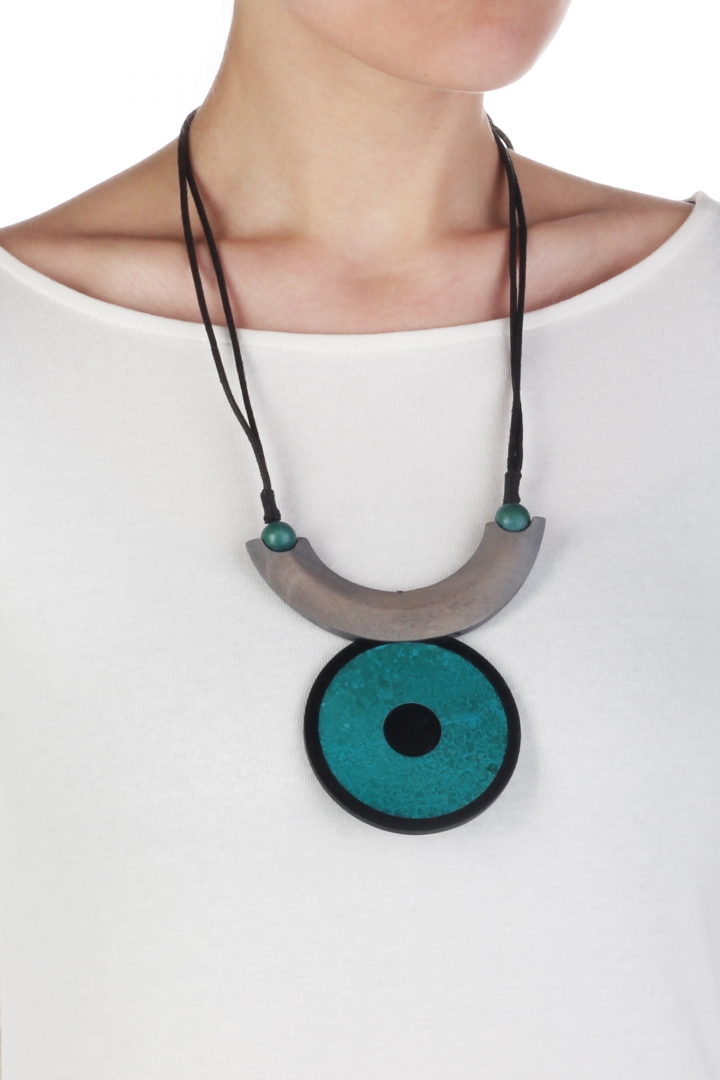 A structurised necklace with a circumspunct in turquoise, black and grey