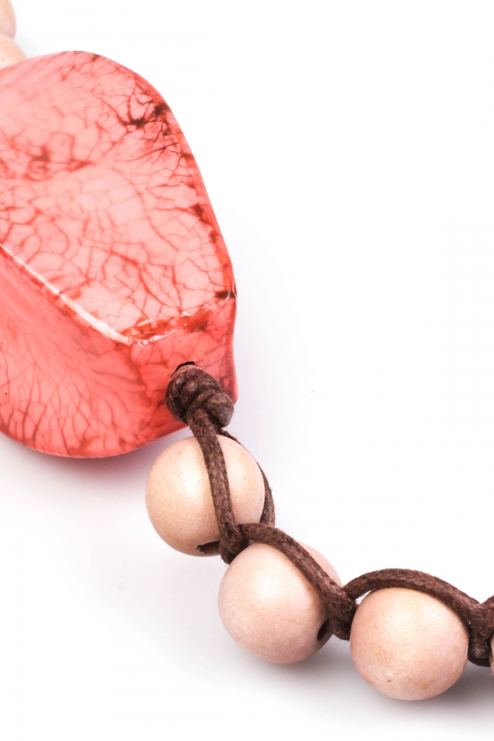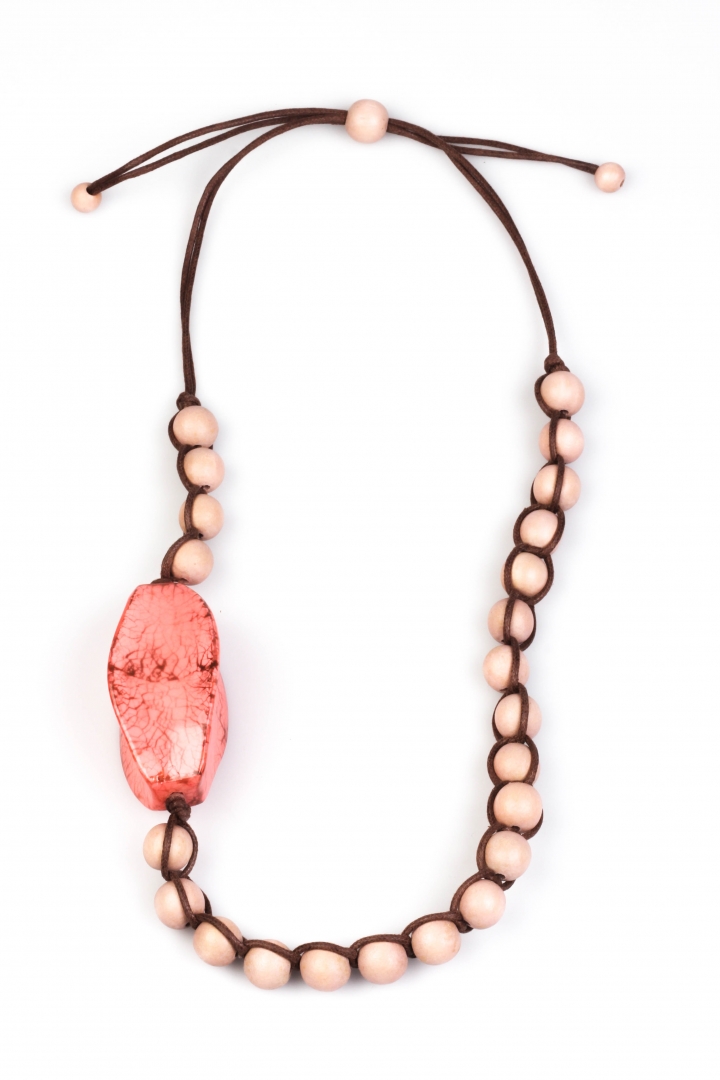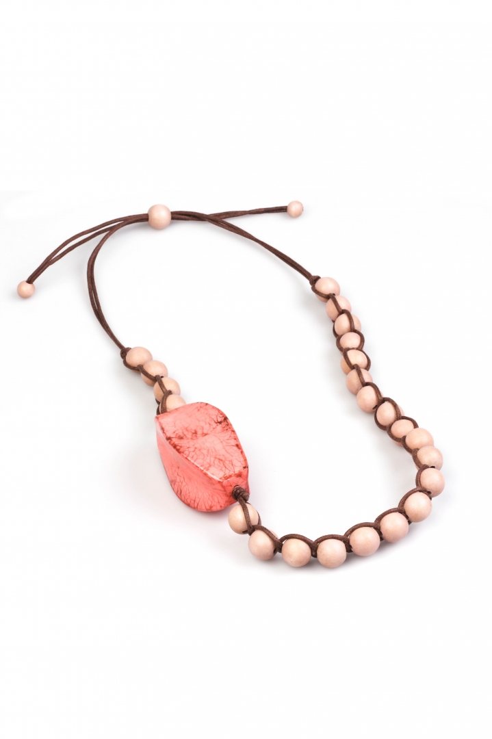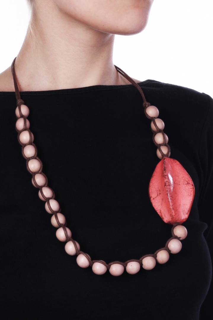 Braided beads necklace with bright rosy center in leafy texture.