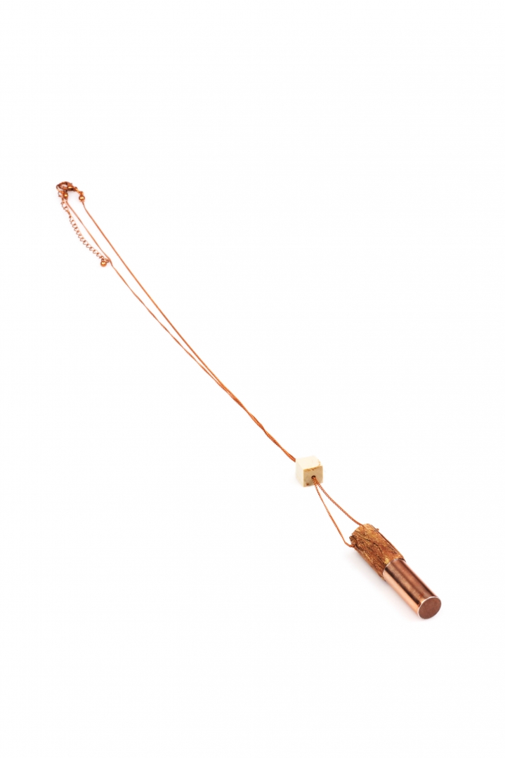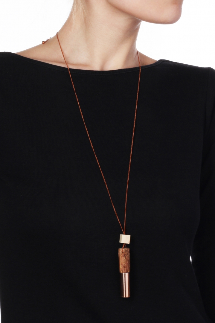 A cylinder shaped rose gold pendant with a harmony of texturized wood and metal.