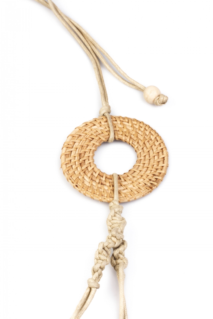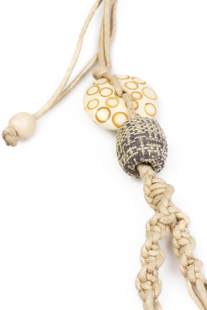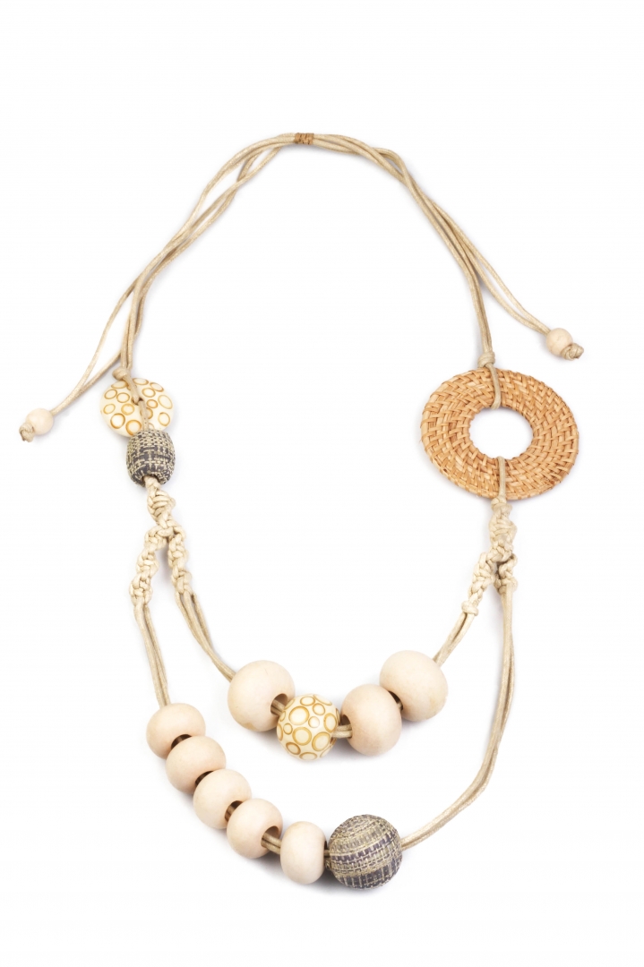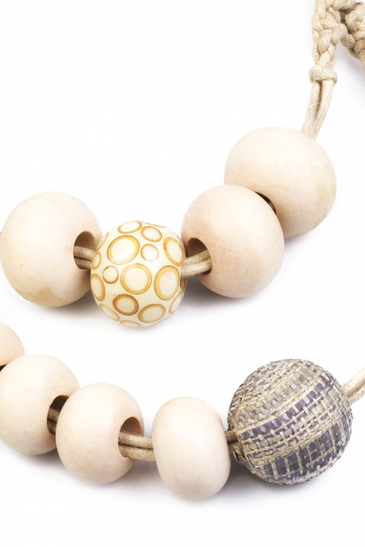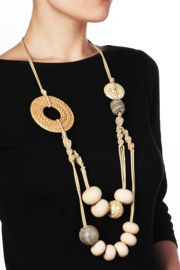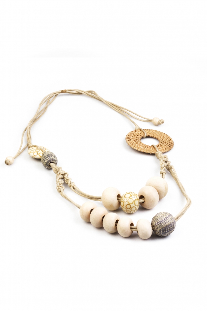 A two layer statement necklace in white/nude with braided staw accent and wooden beads.
