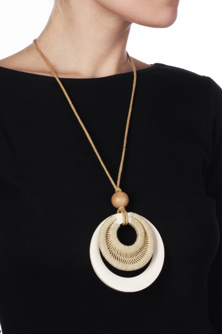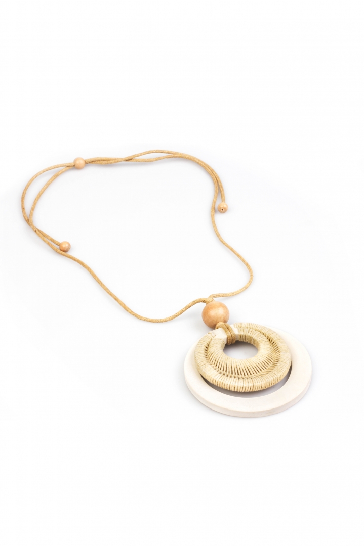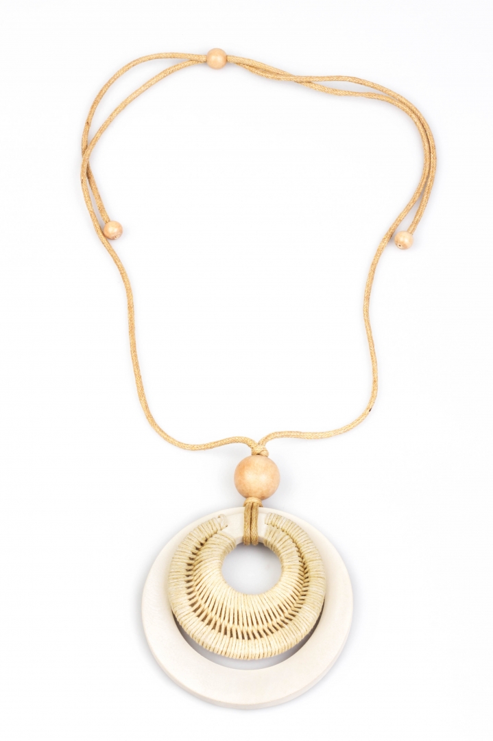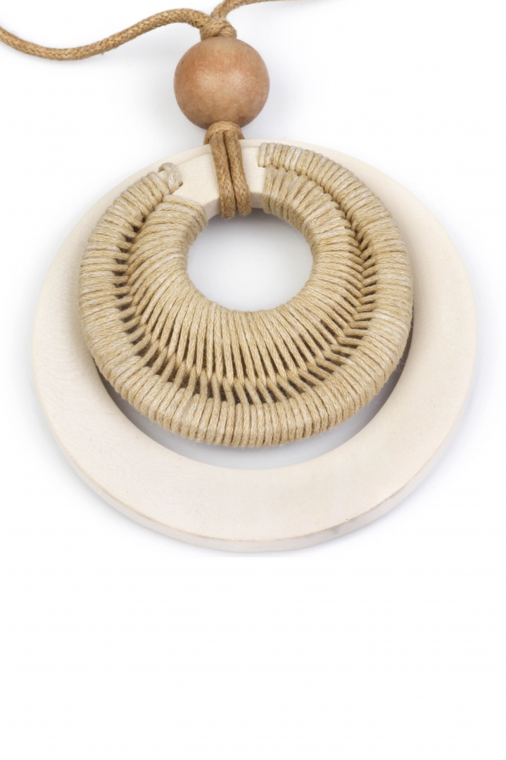 Braided and wrapped string necklace in circular shape and earthy neutral tones.