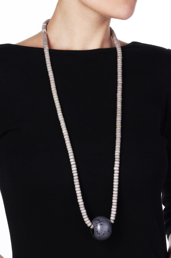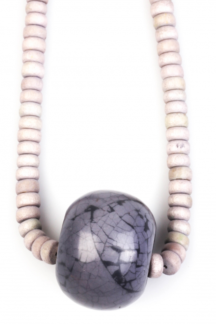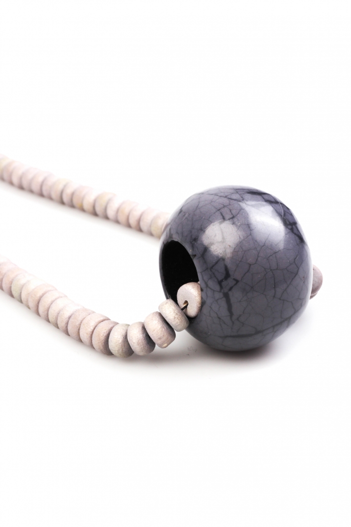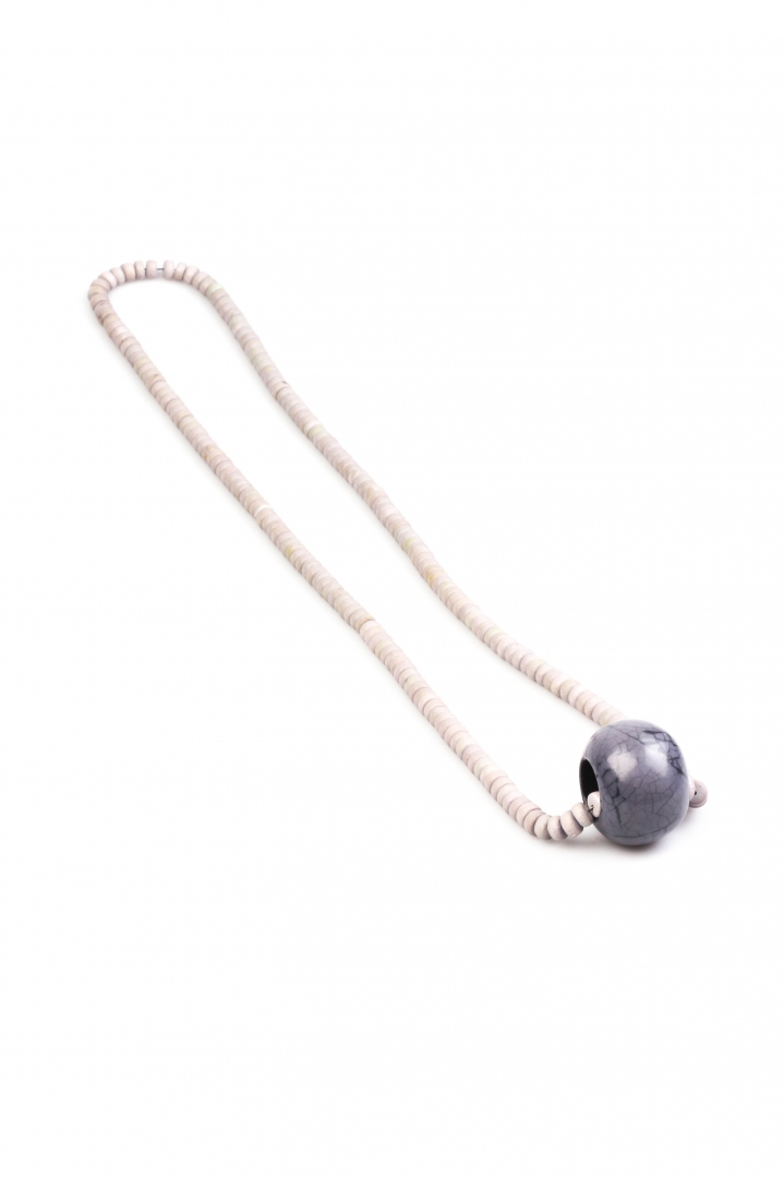 Detailed, small beaded necklace with a bold dark pendant in texturized grey.