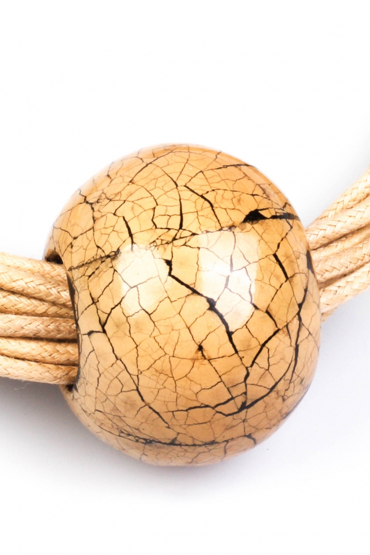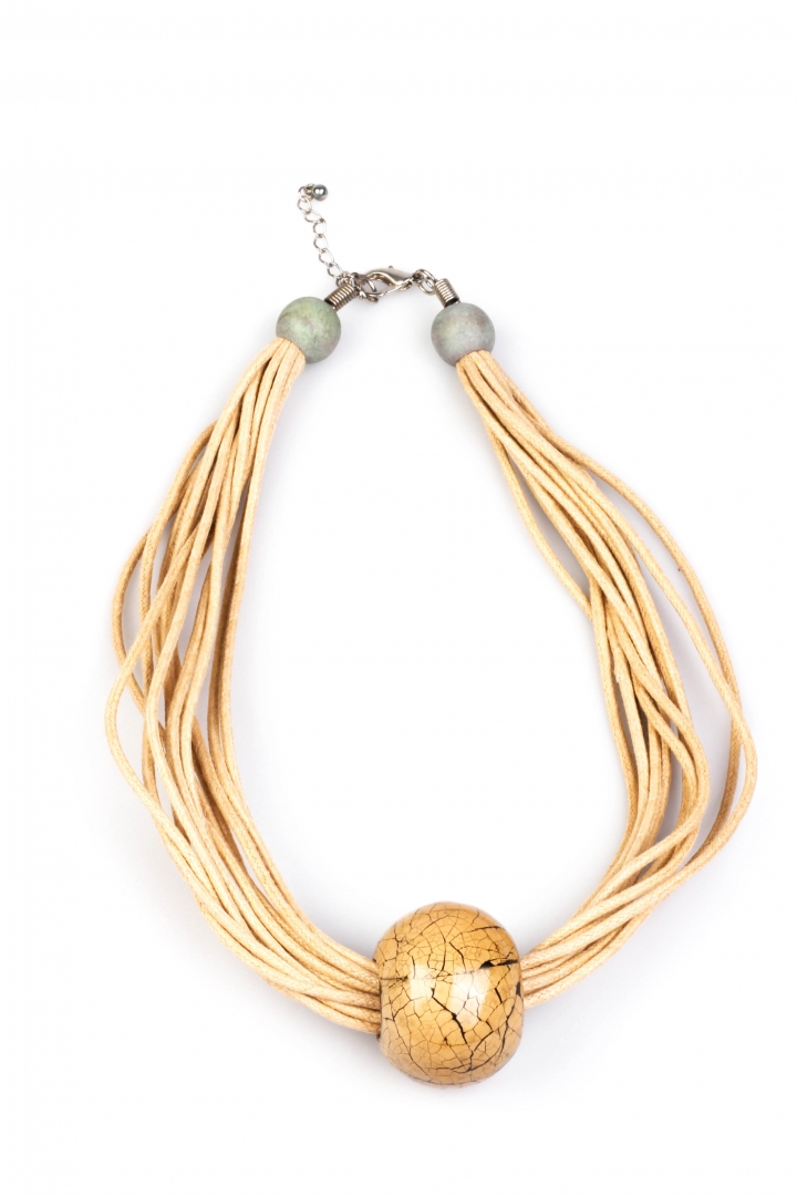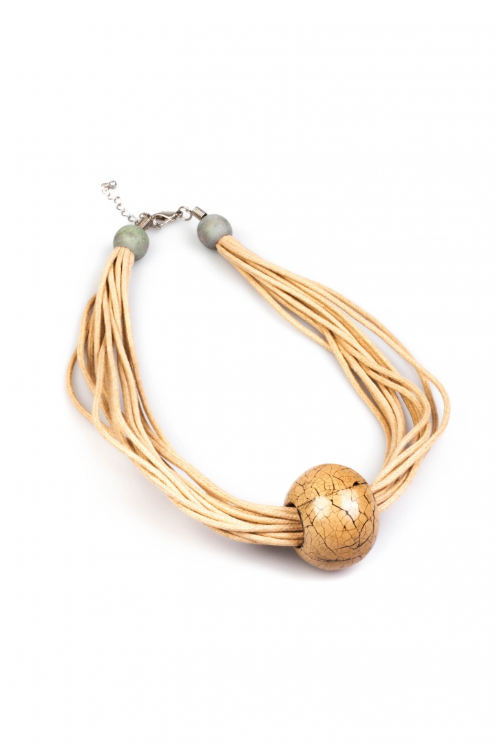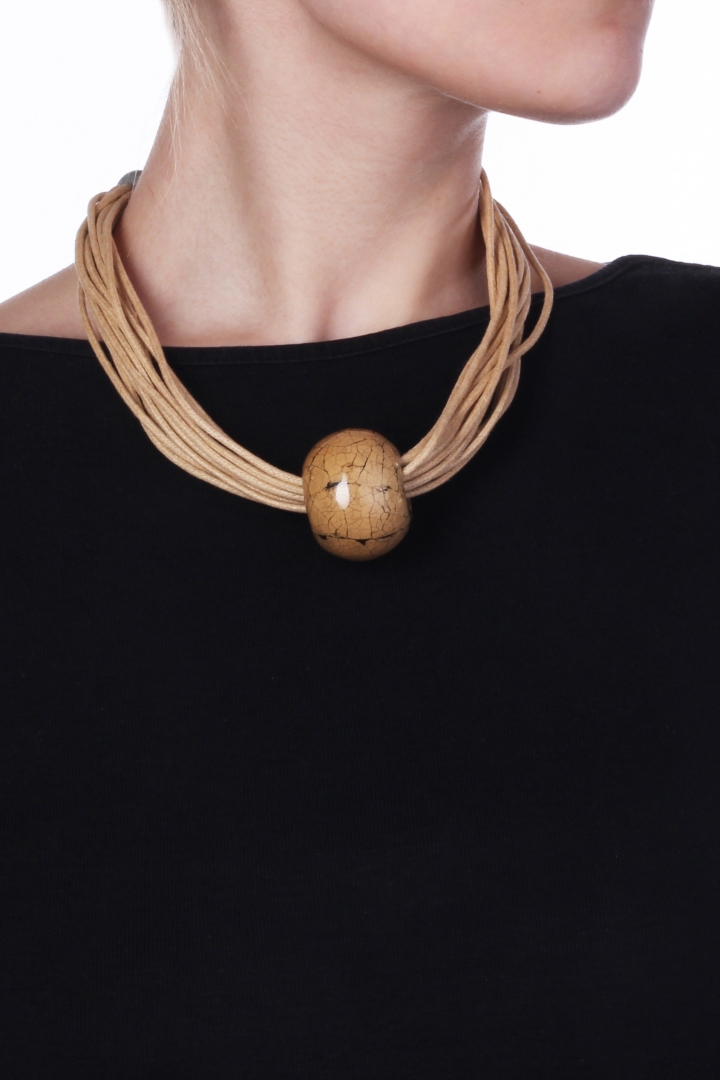 A necklace with multiple strings connected to two end beads, with a bold texturized pendant
