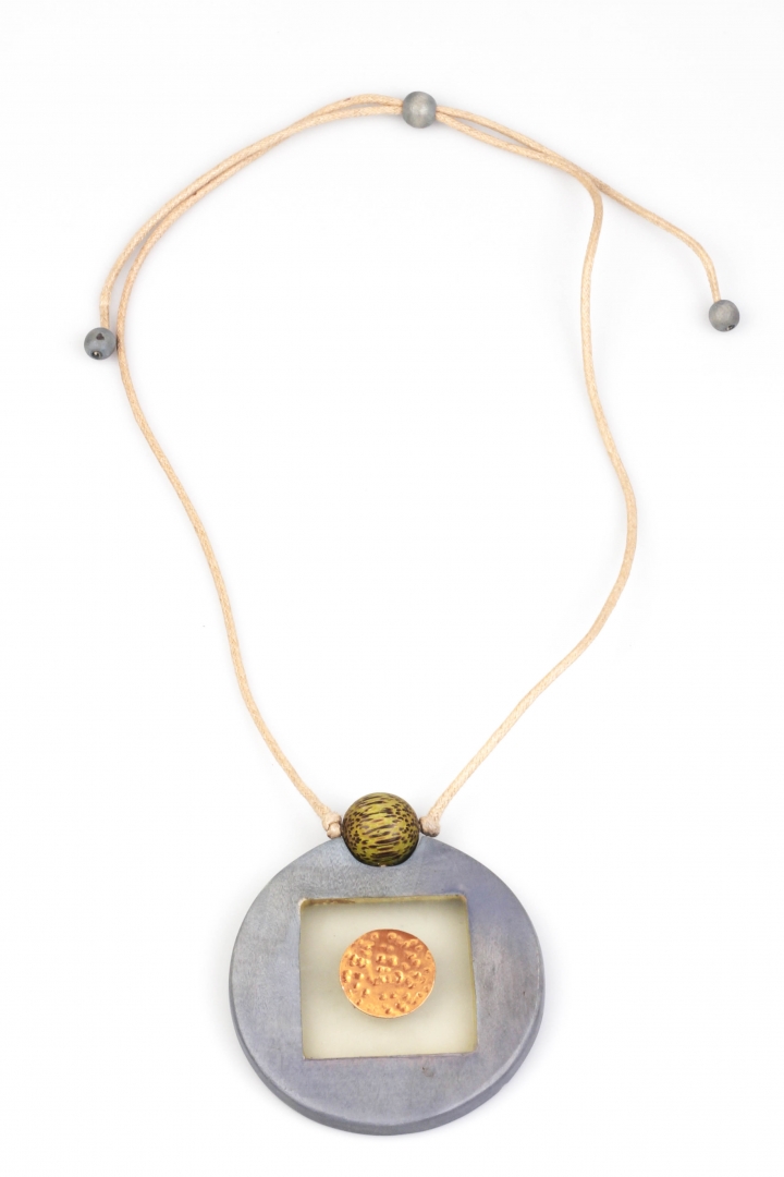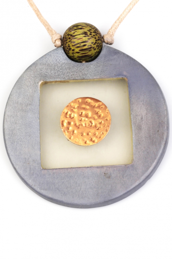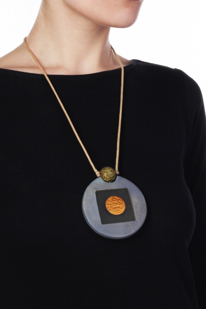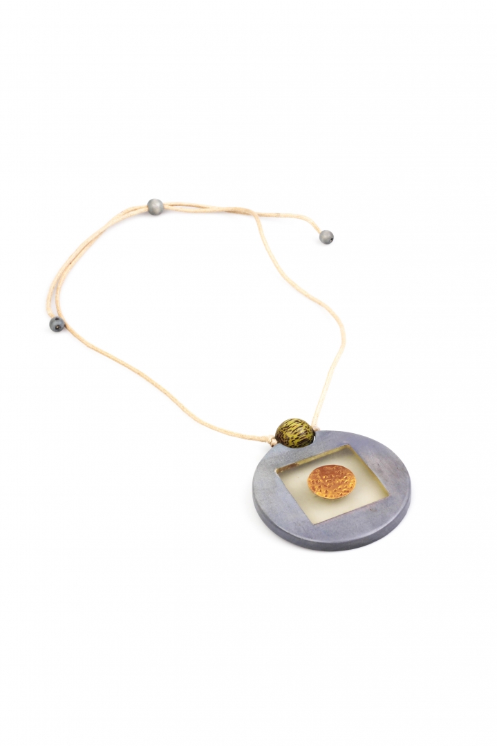 Eye-catching round pendant necklace with see-through details and pop of color.