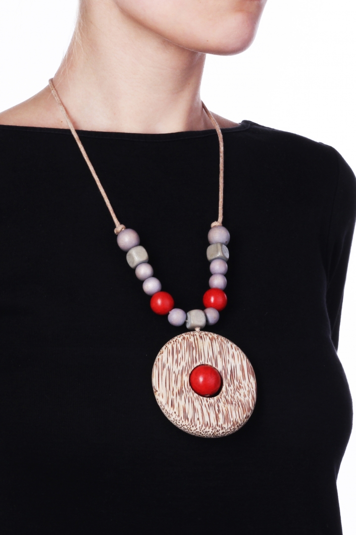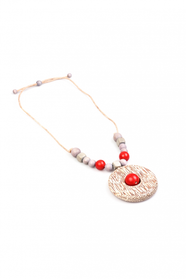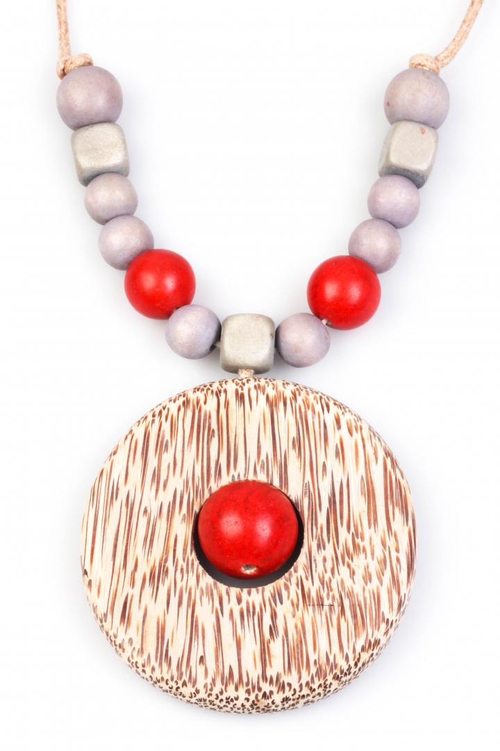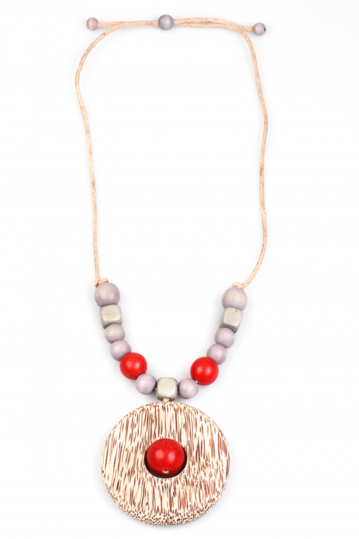 A statement red circumspunct pendant with a beaded necklace for a bold style