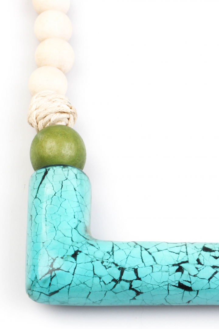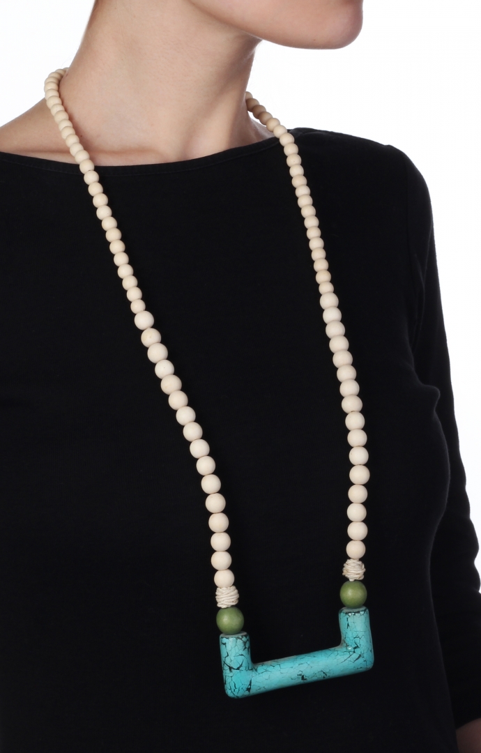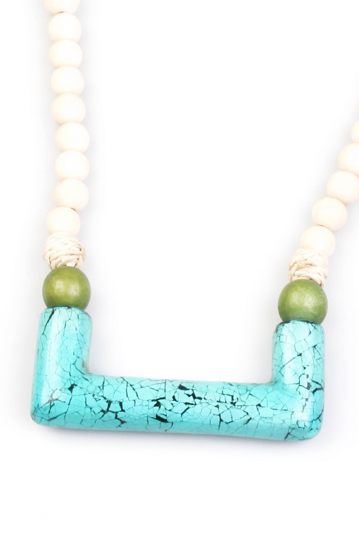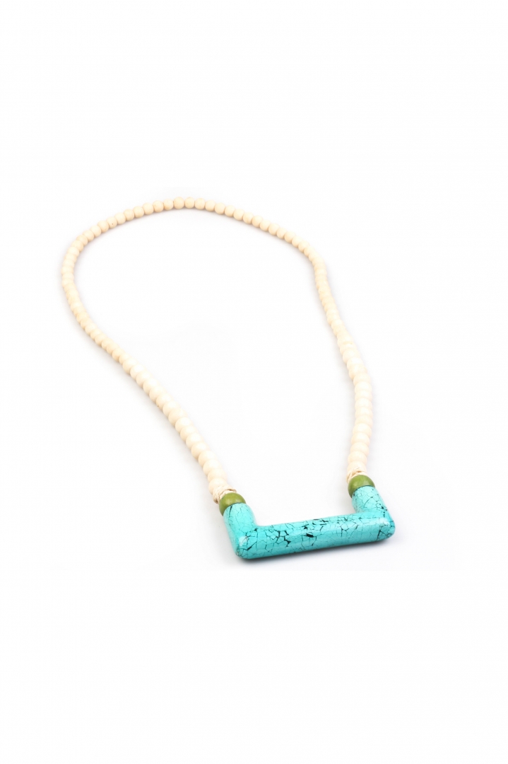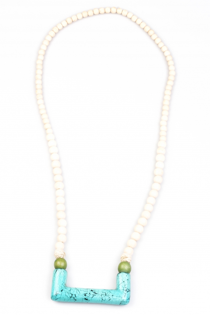 A squared turquoise pendant trailing from white beads forms a chic necklace for everyday look.