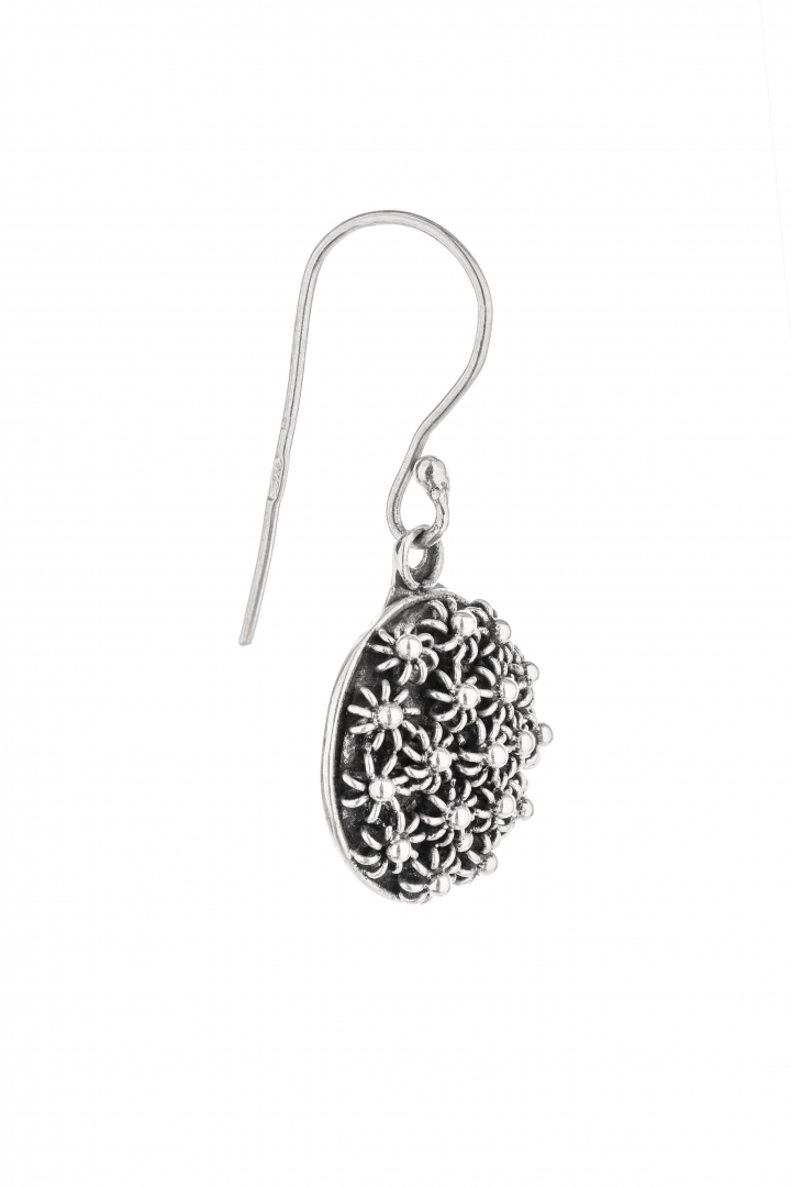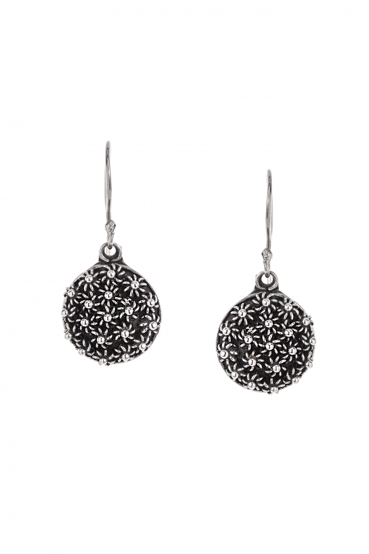 Monochrome silver earrings with minimalistic sun-shaped ornaments.