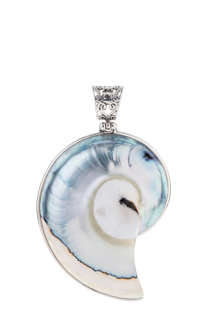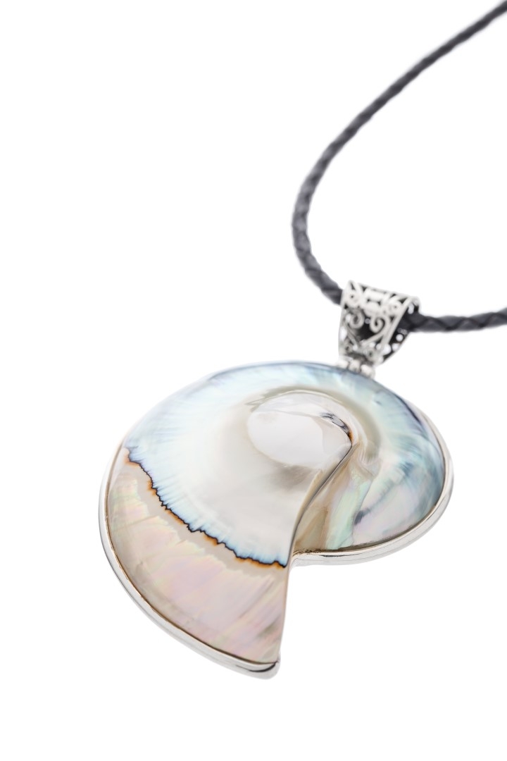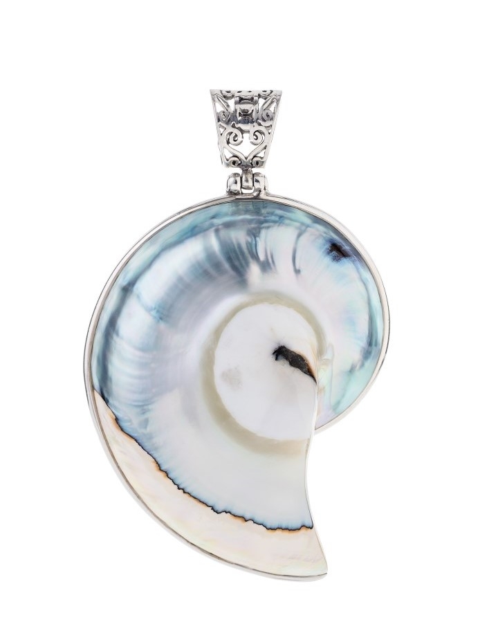 Nautilus shell conists of many layers in different colors. It is also affectionately referred to as the "tail of a mermaid", because of it's divine color and origin. This pendant's whole shell was polished down to the innermost layer to reveal naturally pearlescent blue shades. Each pendant is unique and unrepeatable - a true creation of nature. Generously sized, these shells are guaranteed to make a statement. Nautilus shell will add natural yet eye-catching color, visual interest, and an organic touch to your outfit.