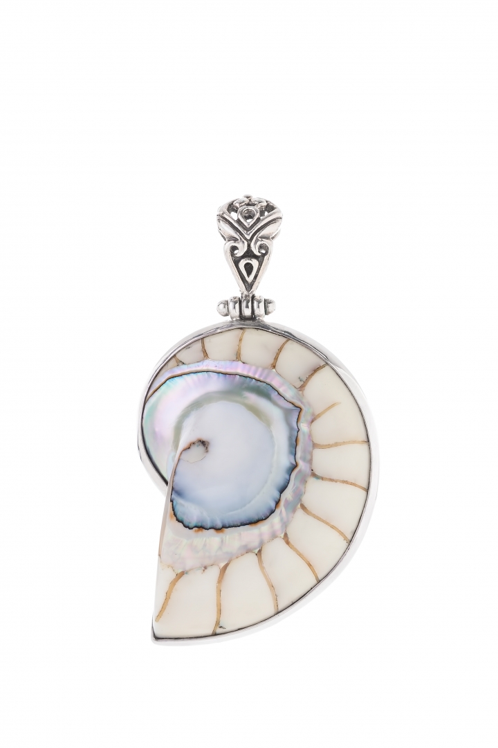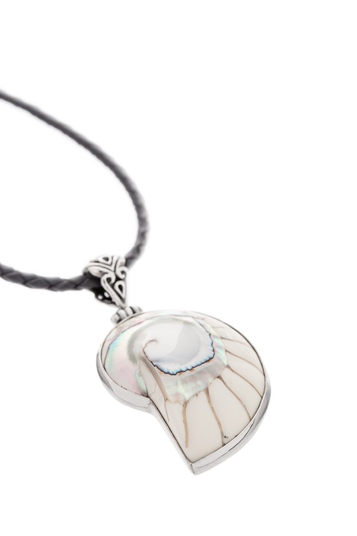 Nautilus shell conists of many layers in different colors. It is also affectionately referred to as the "tail of a mermaid", because of it's divine color and origin. This pendant's whole shell was polished down to the innermost layer to reveal naturally pearlescent blue and white shades. Each pendant is unique and unrepeatable - a true creation of nature. Generously sized, these shells are guaranteed to make a statement. Nautilus shell will add natural yet eye-catching color, visual interest, and an organic touch to your outfit.
