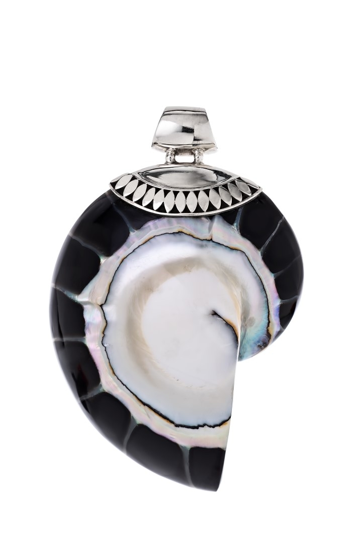This pendant has a simple snap bail that allows the beauty of the shell to shine. Crowned by graceful ornamented silver.