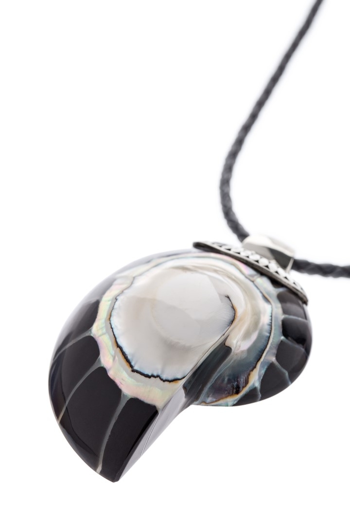 Nautilus shell conists of many layers in different colors. It is also affectionately referred to as the "tail of a mermaid", because of it's divine color and origin. In this case, pendant's whole shell was polished down to the black layer to reveal naturally pearlescent mix of monochrome shades. Each pendant is unique and unrepeatable - a true creation of nature. Generously sized, these shells are guaranteed to make a statement. Nautilus shell will add natural yet eye-catching color, visual interest, and an organic touch to your outfit.