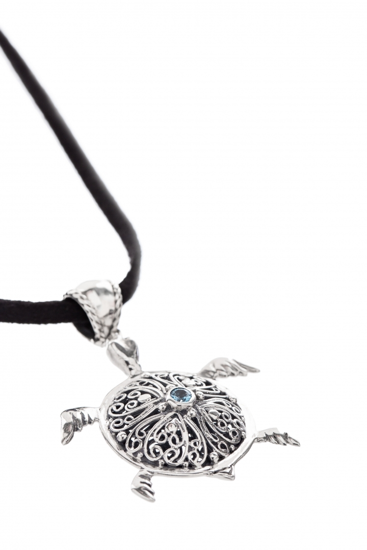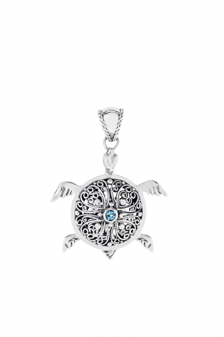 A delicately decorated four-winged circle pendant with centered queenly blue topaz.