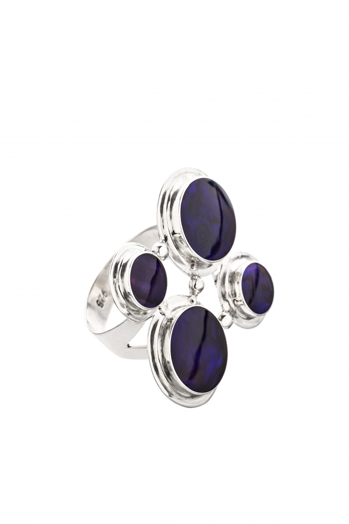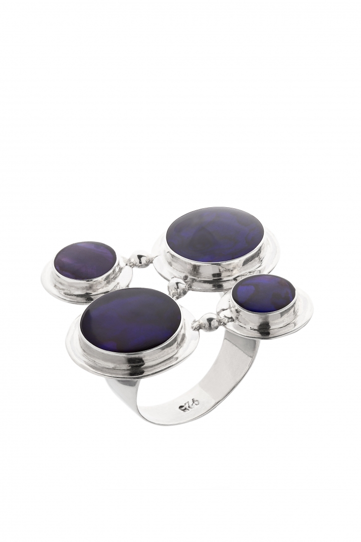 A vibrant dark purple shade shell base ring enveloped in precious silver, all shaped in four connected circles.