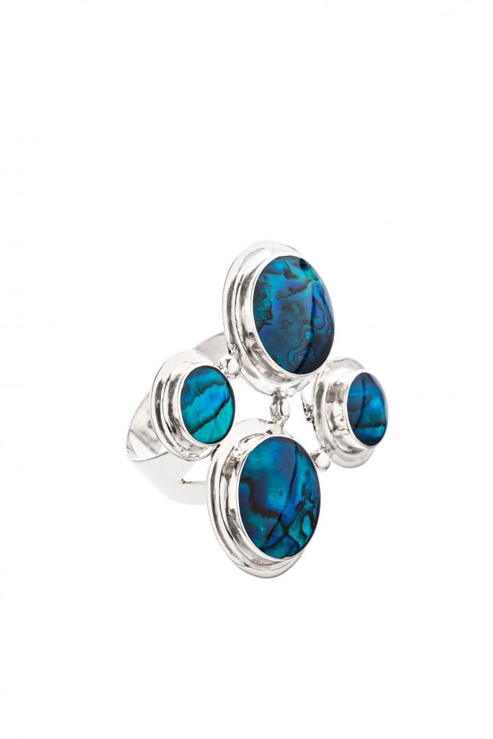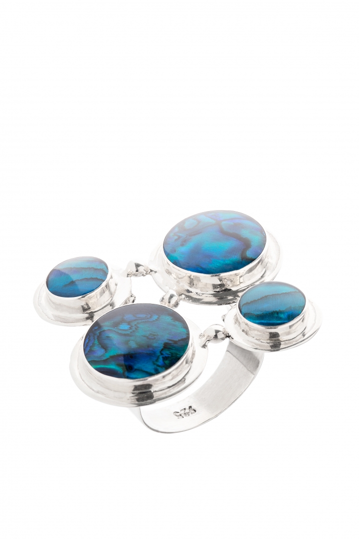A vibrant blue shade shell base ring enveloped in precious silver, all shaped in four connected circles.