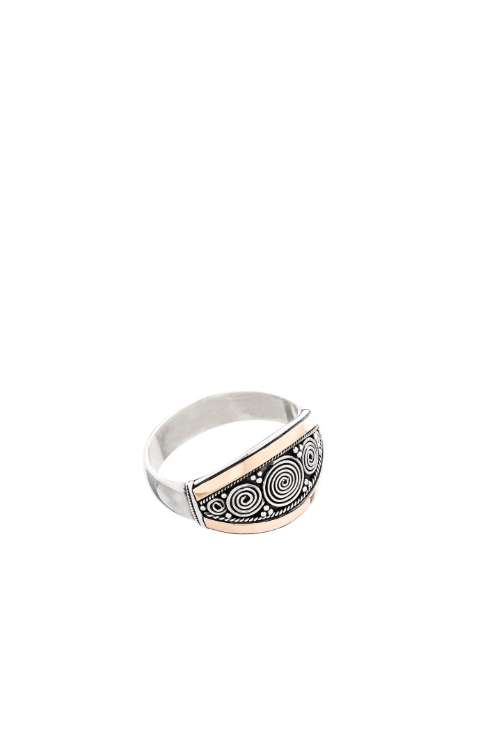 A ring of sterling silver ornamented by colouring and a trio of spirals. Spiral as a symbol represents the path leading from outer consciousness and materialism, external awareness to the inner soul and enlightment. For those who seek spiritual advancement and inner peace.